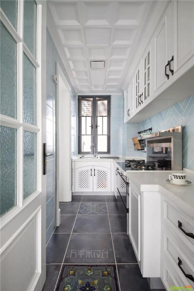 厨房,采用蓝色作为整体设计基调。考虑日后方便打理,墙面采用了浅蓝色釉面仿古瓷砖铺贴。地面采用仿古面深蓝色,既保证了与餐厅的协调性,又达到了防滑的实用性。