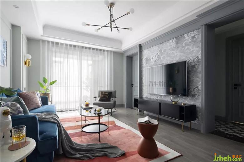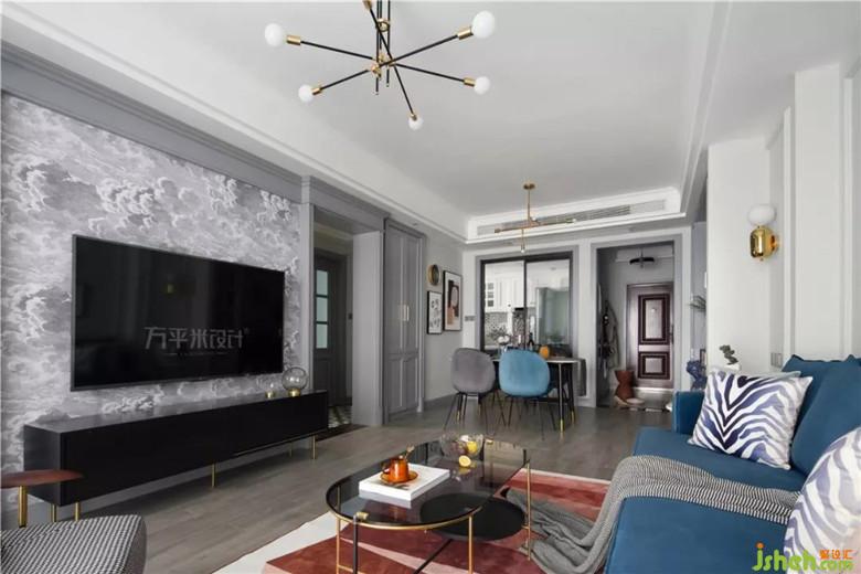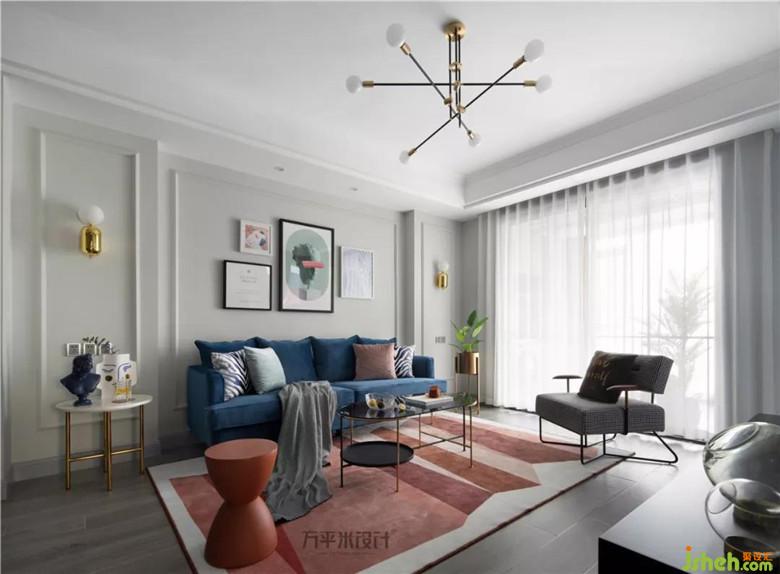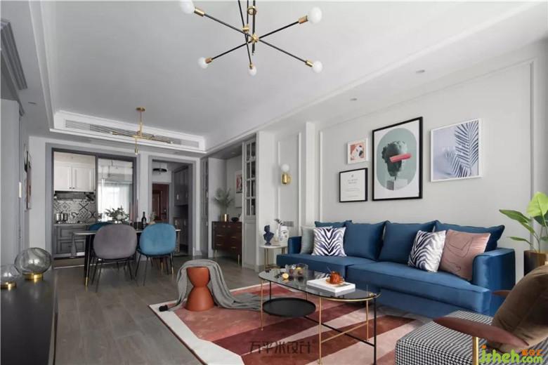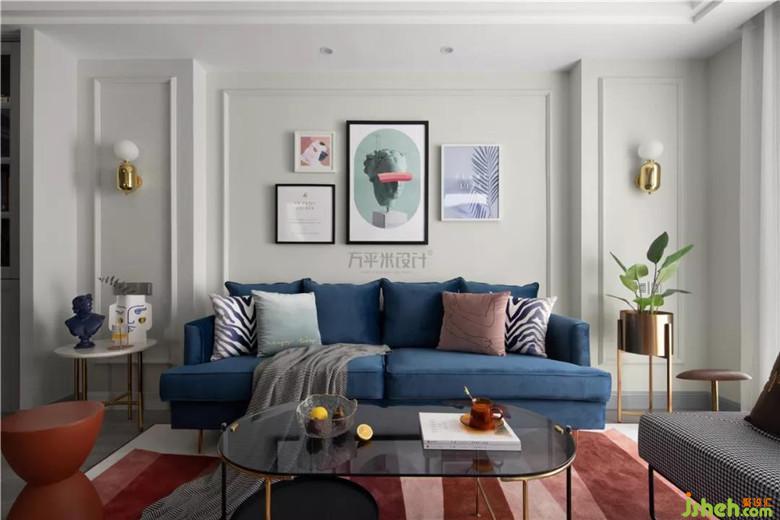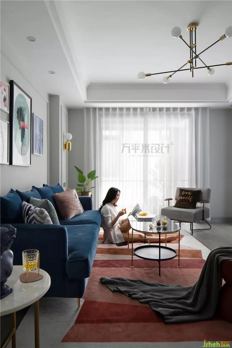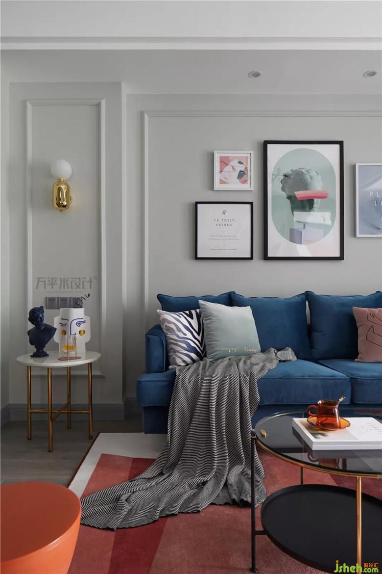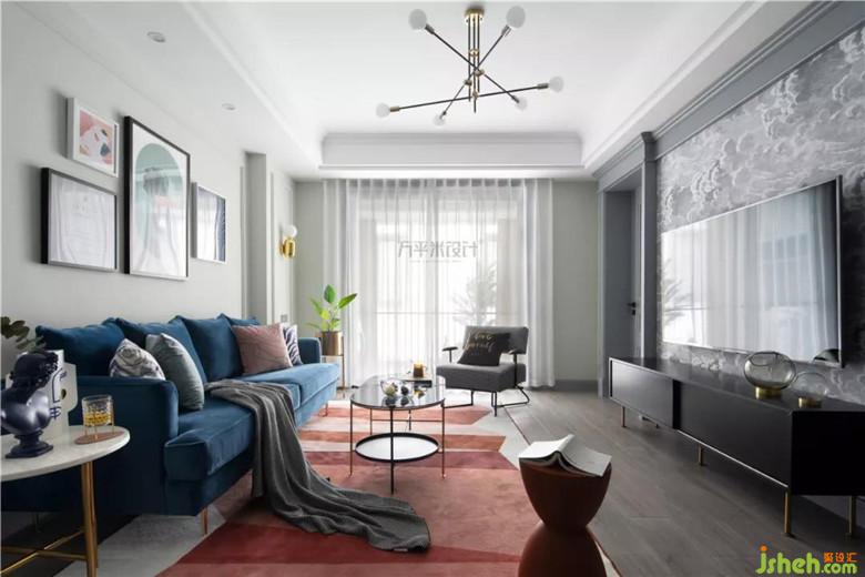 撞色的靛蓝丝绒沙发与砖红地毯,触感细腻温柔,随意而放松。色彩跃动,成为空间亮点。复古的千鸟格单椅,相映成趣。主卧入口调整至电视墙一侧后,设计师将其与走廊门洞形成整体、做出具有层次的造型。调整尺寸后使电视墙面与沙发背景得以居中对称。简约的线框墙面围合沙发主位,特意选用不对称的组合画作装点,营造随意无拘的轻松感。轻盈的茶几及边几的选择,从体量上释放客厅空间。使令会客区域更显通透舒适。