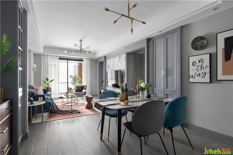 精致而轻盈的大理石餐台,令就餐环境宽松通透,承载着每日饱含爱心的餐点。温柔雾霾蓝与浅灰色餐椅撞色相搭,呼应于同一开敞空间的靛蓝沙发用色。