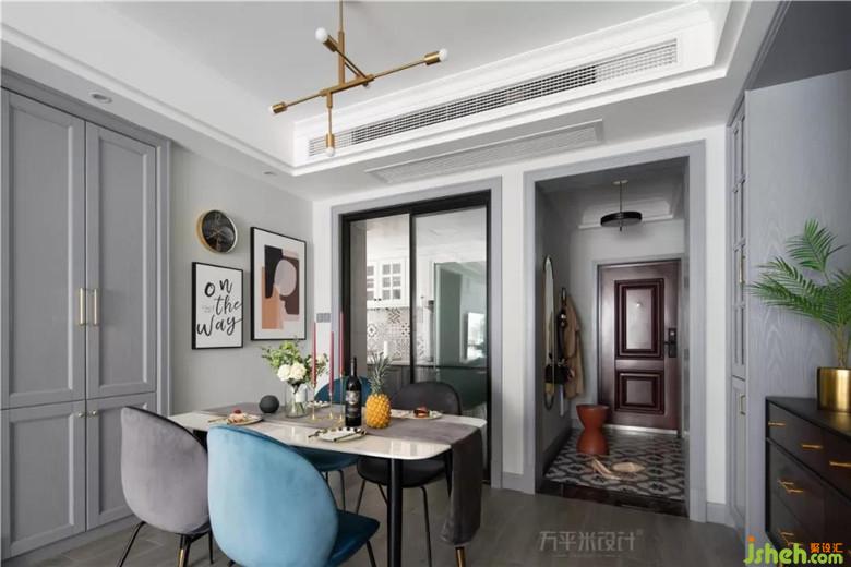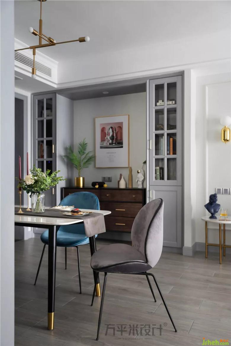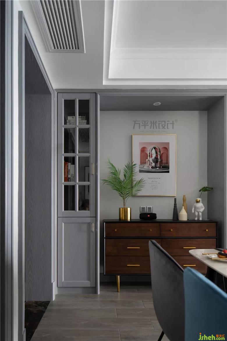 走廊通道一侧的两组对称展示柜,中部留空嵌入斗柜,以保留纵向空间通透为主要考量,又提升了餐厅的收纳及展示功能。