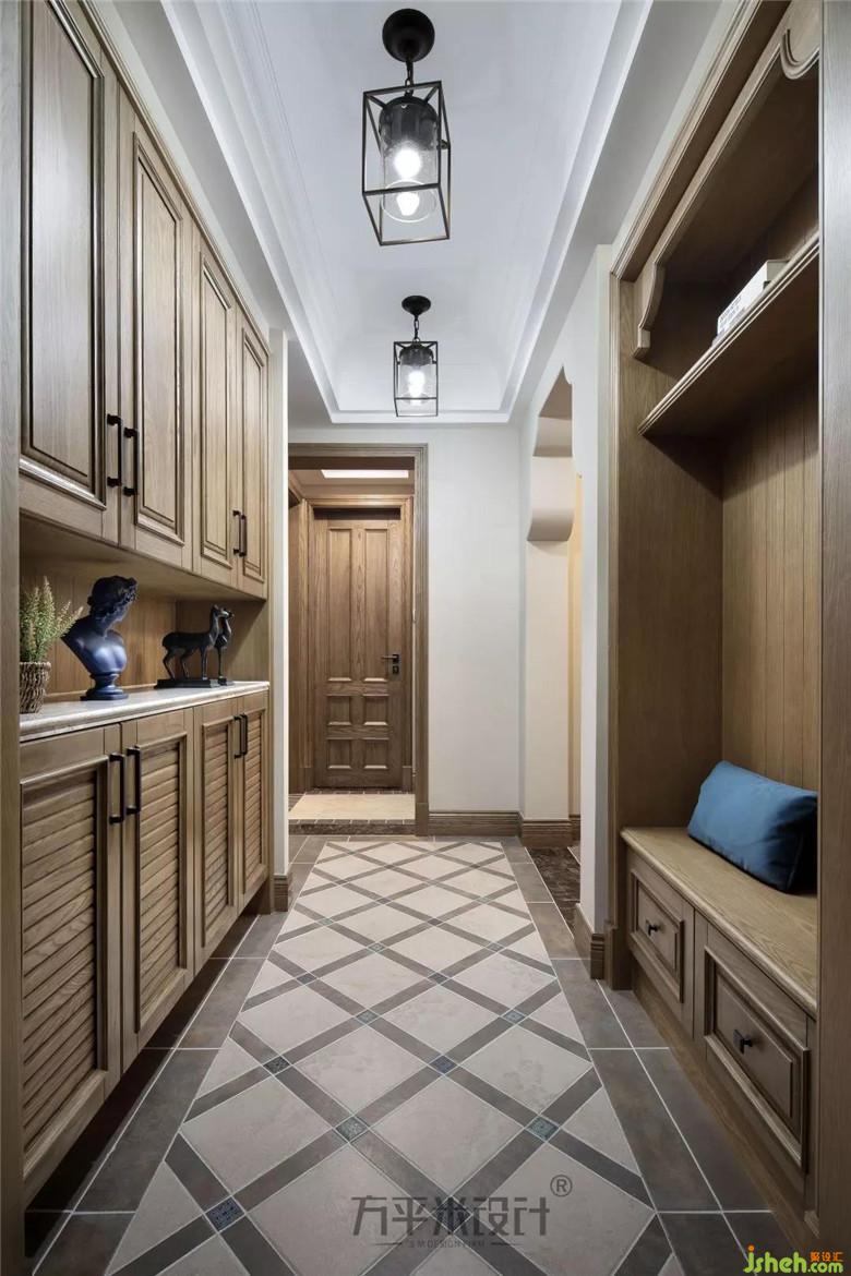 别墅装饰柜门采用原木制作,左侧设置鞋柜储物区,将中间进行镂空,可放置钥匙、雨伞等小物件,底部留空后,方便鞋物摆放,使门厅更为整洁。我们将右侧设计换鞋凳和抽屉的组合,让日常换鞋更为舒适便捷,从生活出发,简单明了。