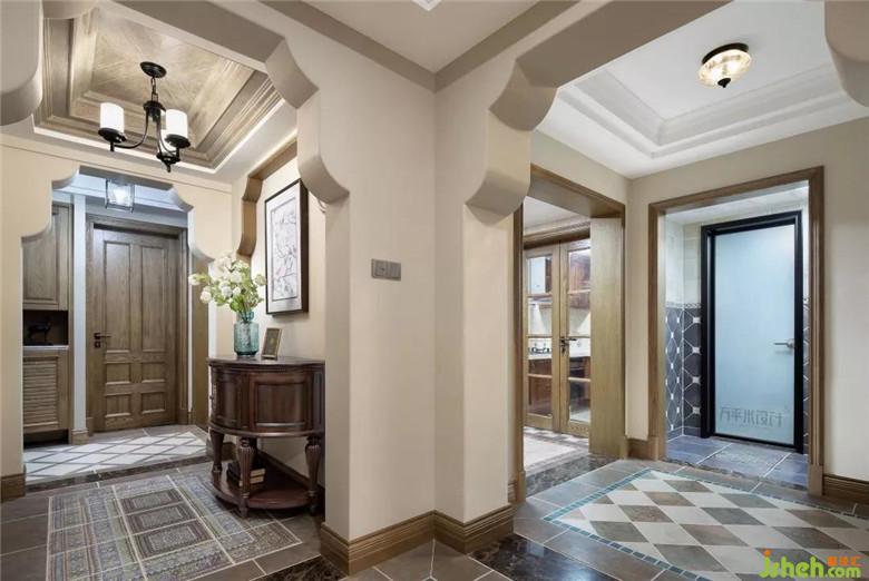 拱门造型内弧轮廓按照黄金美学比例分割,贴合美式传统元素,更具浓厚古典韵味,带着欧洲古堡的厚重和美式的随性跃动。运用了美式中经典的门套造型弧线,在整体空间中不断重复,交相呼应,给人以美感。