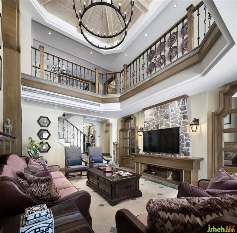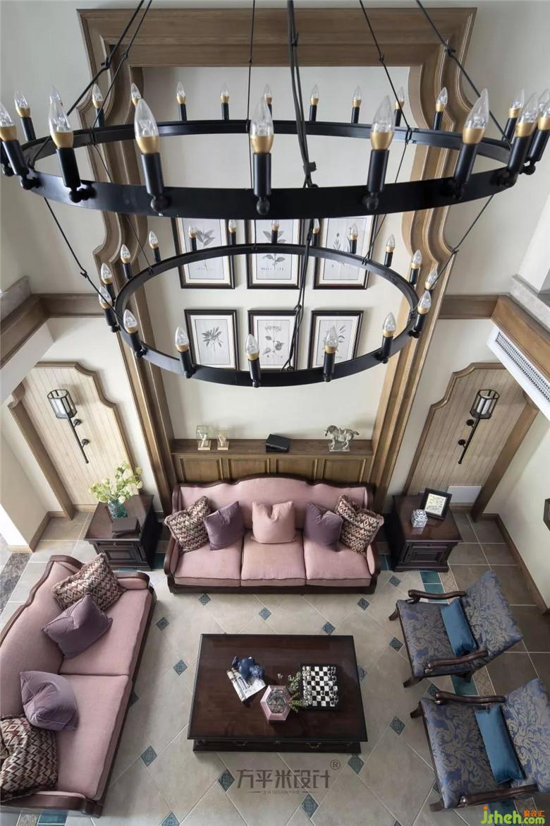 从二楼过道俯瞰客厅整体,视野开阔,挑高的切角穹顶造型,多层次的细节描绘出客厅恢弘的空间气质,双层环形烛台铁艺吊灯,提升美式古典空间氛围,点亮空间照明。