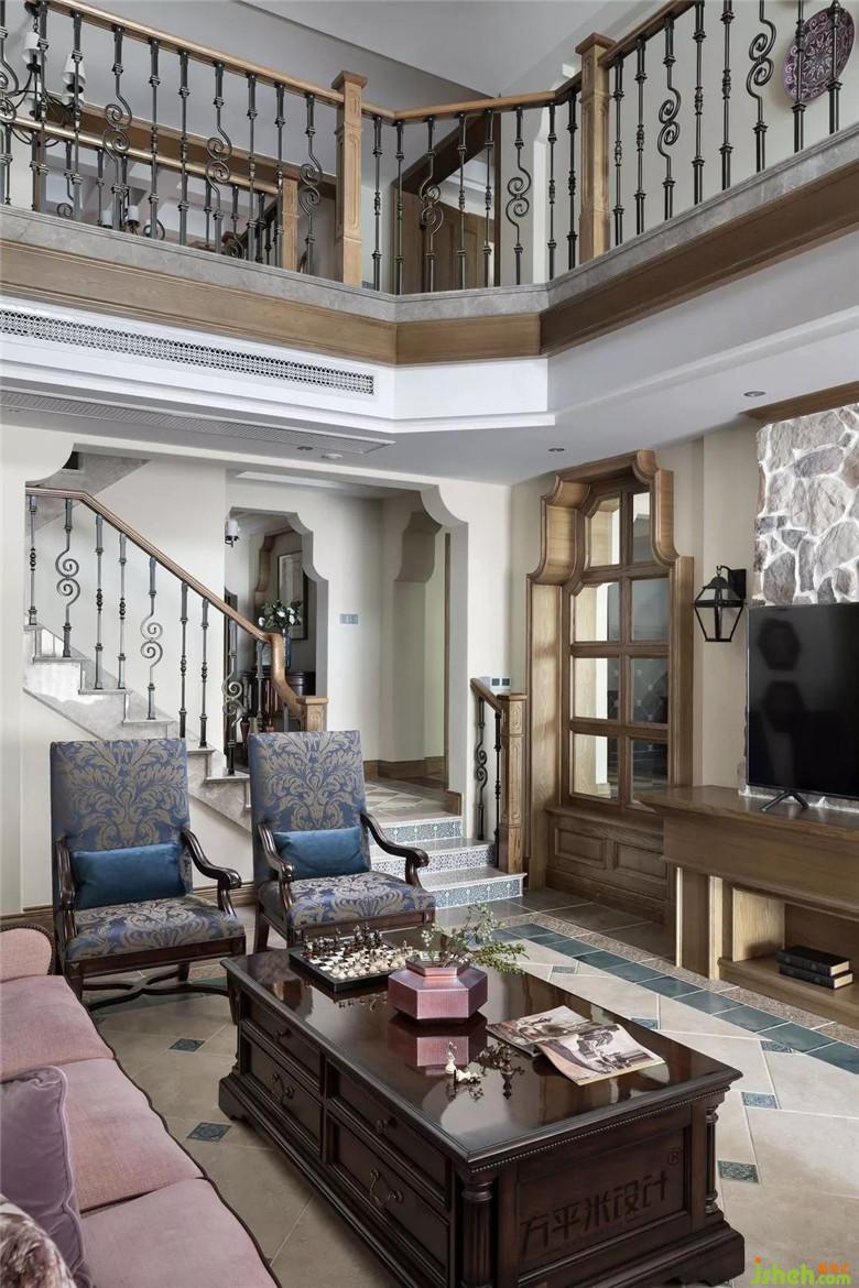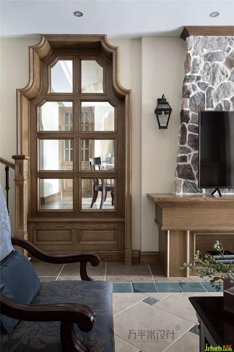 客厅顶面原为长方结构,为符合整体空间格调,保证过道高度,设计师和施工人员现场不断进行推敲演算,最终确定吊顶角度和高度,形成既满足整体布局又具风格特色的风化白米字形吊顶。