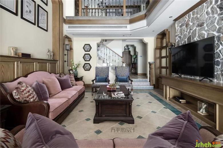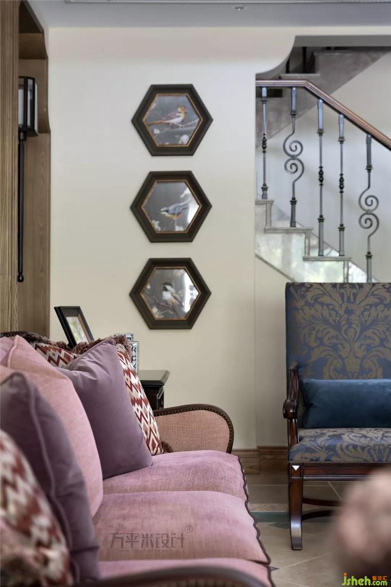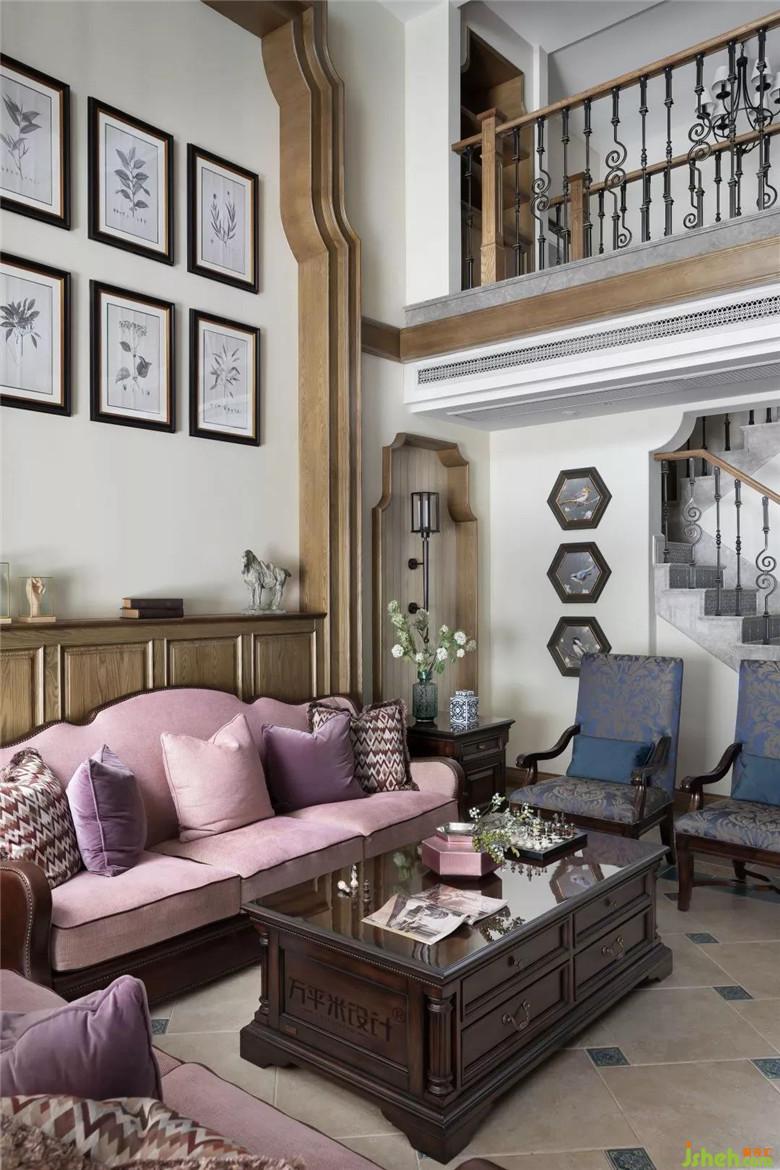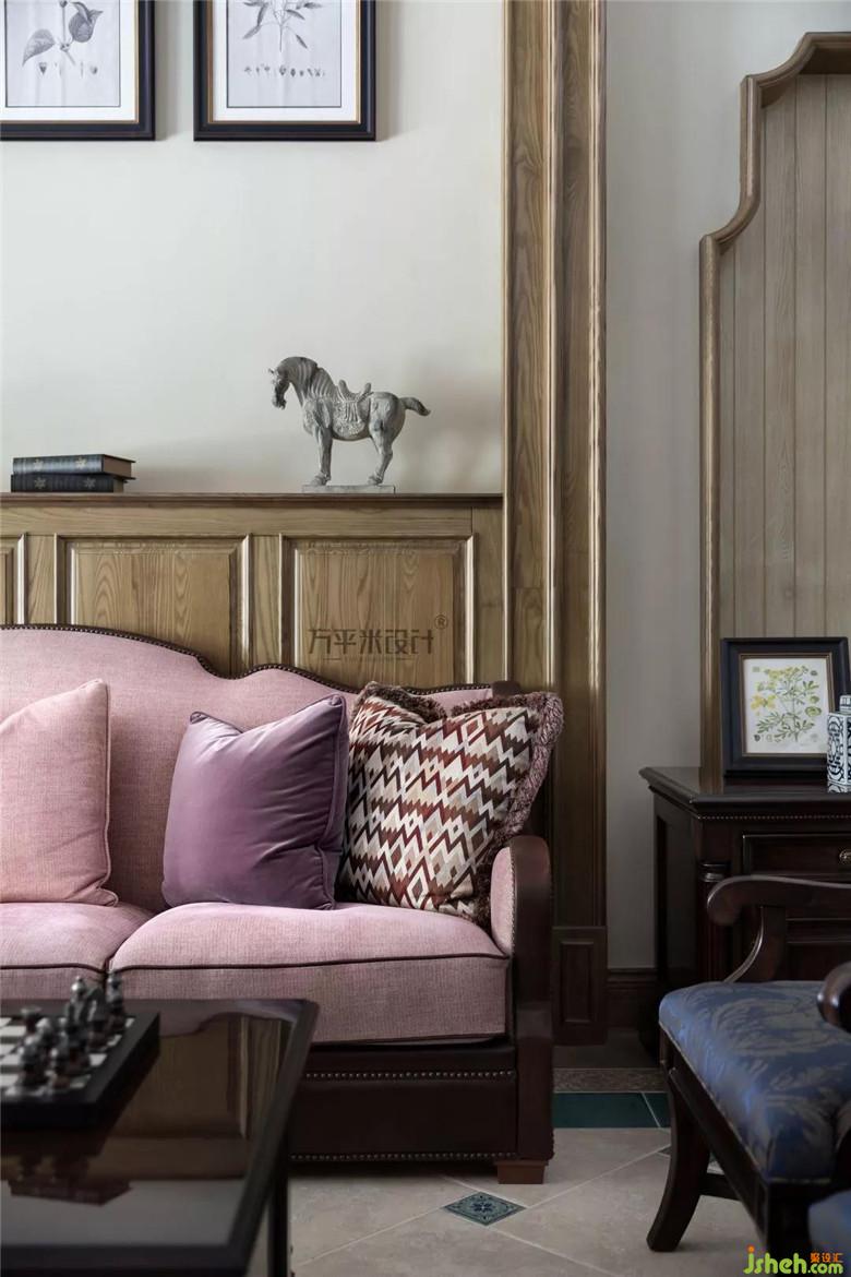 茱萸粉的古典沙发,缀以略带灰度的香芋紫,布艺和绒面交融的质感,相互印衬。