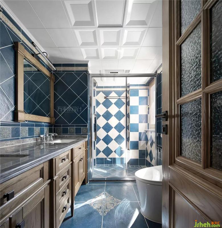 沐浴是一件很享受的事情,孔雀蓝瓷砖缀以方形白色,搭配定制双盆洗漱台,整体色调带着历史的古朴和亮眼的别致。或许这里并不需要伴随着奢华,自在随心便能放松身心,释然一天的疲惫。