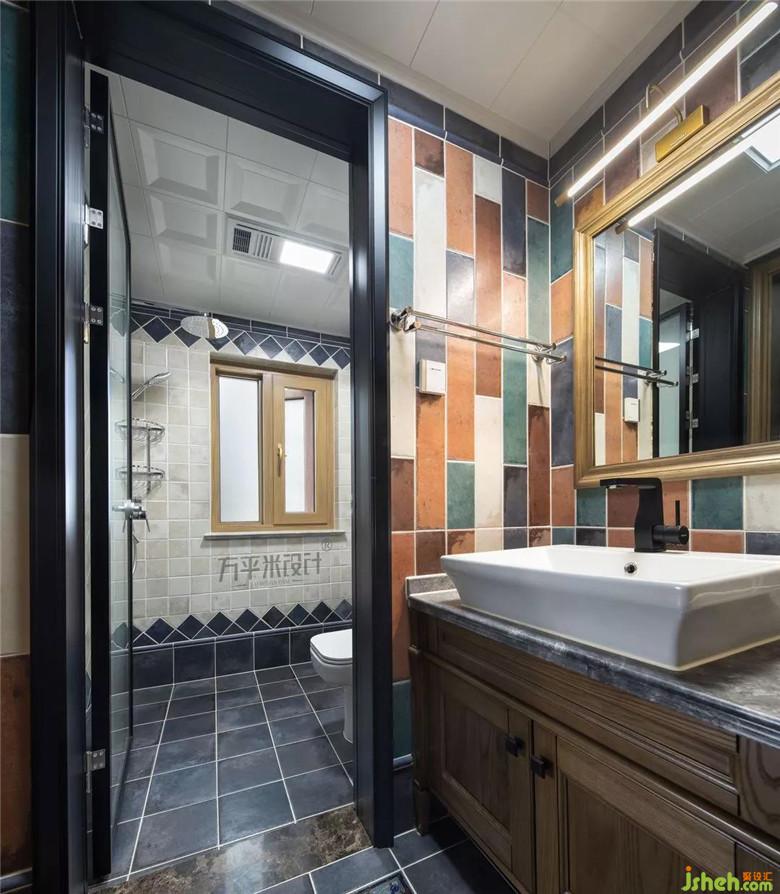 小孩房卫生间延续一层主卫手法,地面选用了靛蓝色磨砂质感仿古石地砖,墙面铺贴了橘色长形小砖,材质统一,整体色彩更显活泼。