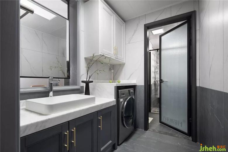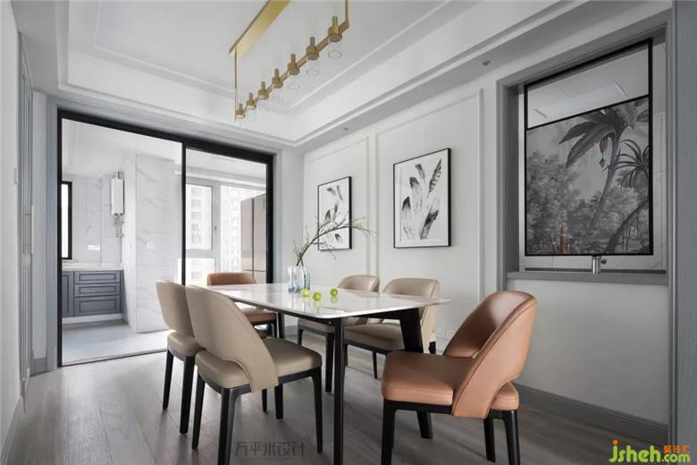 连接盥洗区台面的窗洞,设计以轻盈的墙布装饰挂画,既丰富了墙面装饰,同时加强了空间之间的互动性,使家人在互通的空间中,沟通变得更加轻松,也改善了餐厅与盥洗区的采光。