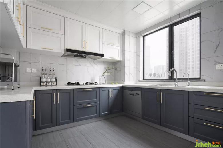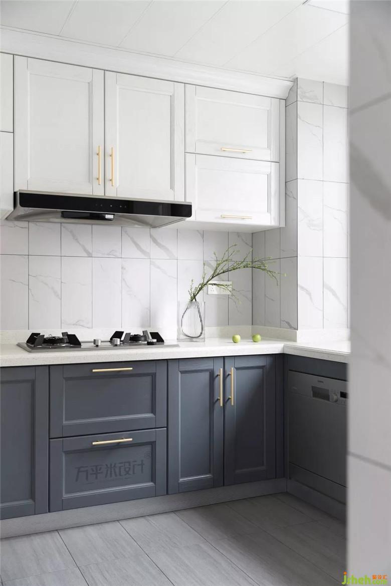 空间上部柜体及墙面以白色为主,下部柜体则使用较为深沉的蓝灰色。二者对比之间,以色彩的设计手法,拓宽了空间视觉体验。