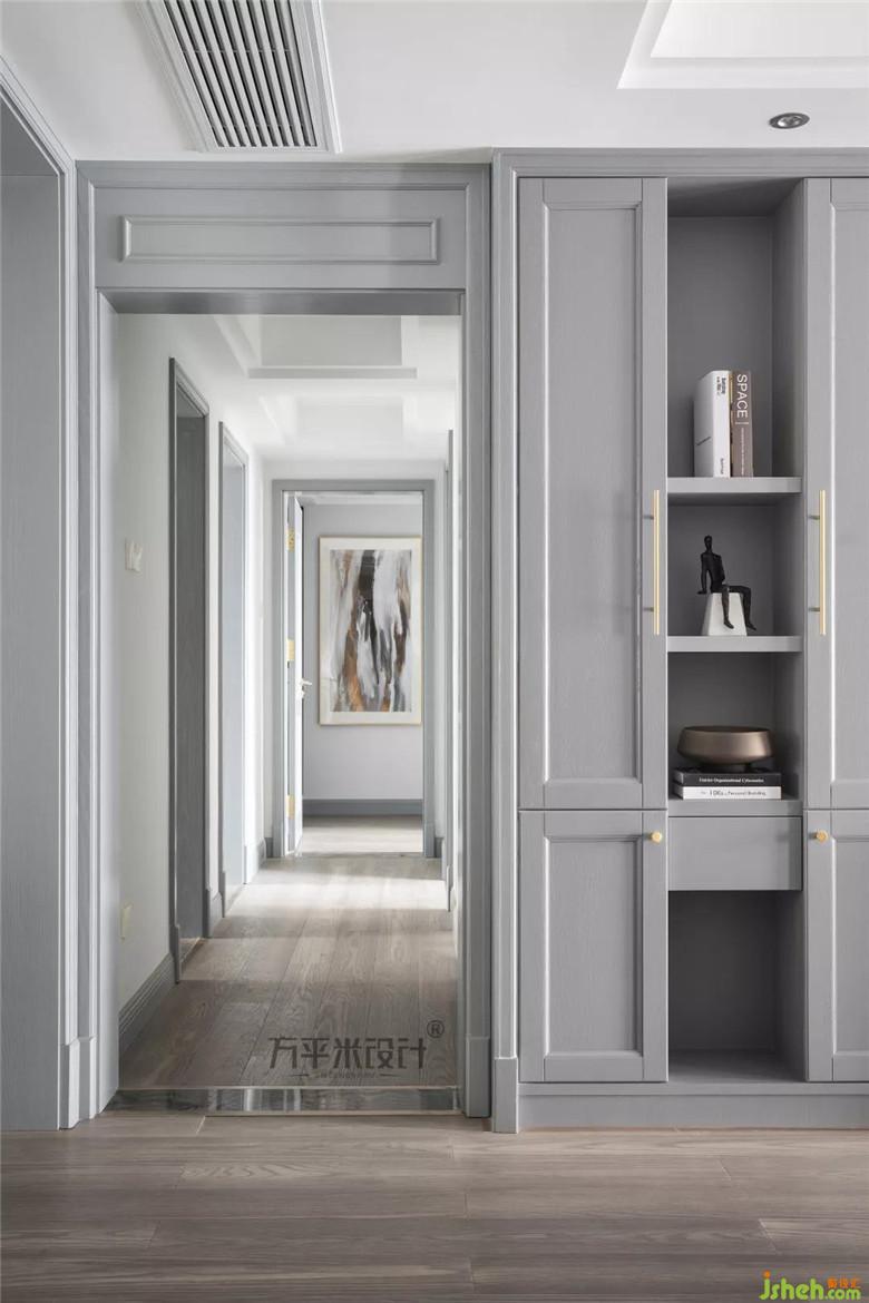 主卧房门外移,缩短过道面积,提高空间利用率。终端墙面设置抽象装饰挂画,起到迎接使用者视线的作用。