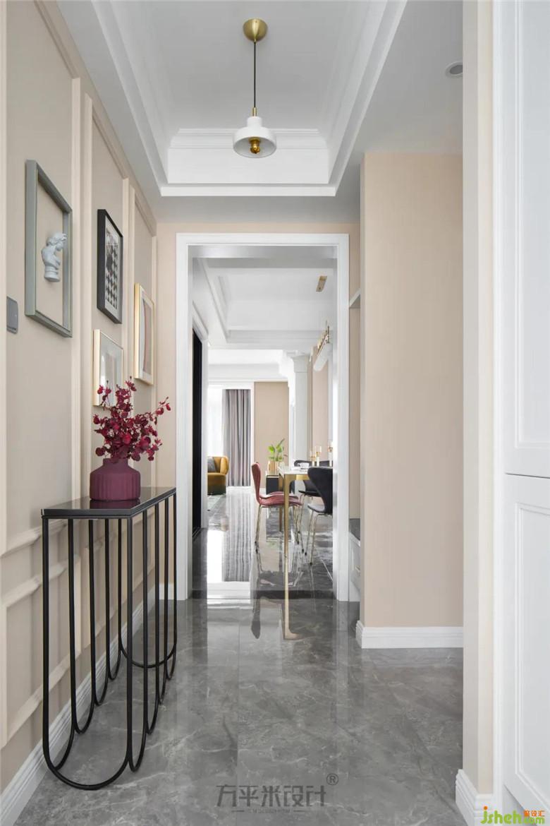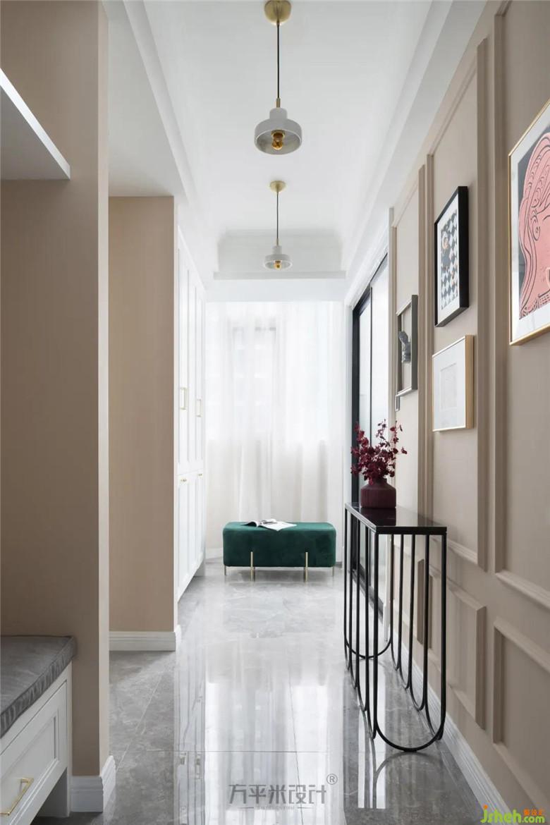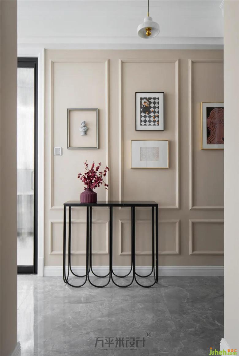 主墙装修公司运用简单的线条,勾勒美式轮廓,搭配复古装饰画组与弧线形玄关台碰撞出艺术的美感。