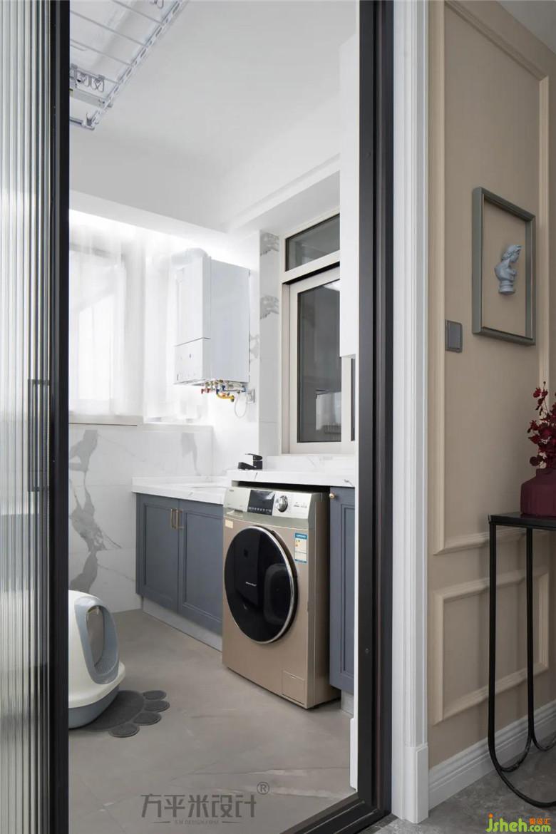 装修公司利用长虹玻璃若隐若现的遮蔽效果,维系阳台外观的整洁视感。区域内打造洗衣操作台,让洗衣机有个好的“归宿”,同时缩短晾晒动线,让日常生活更为便利。