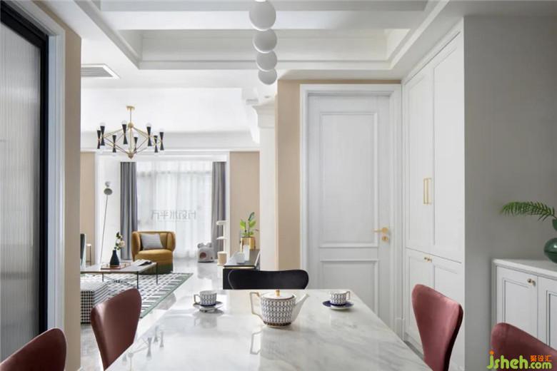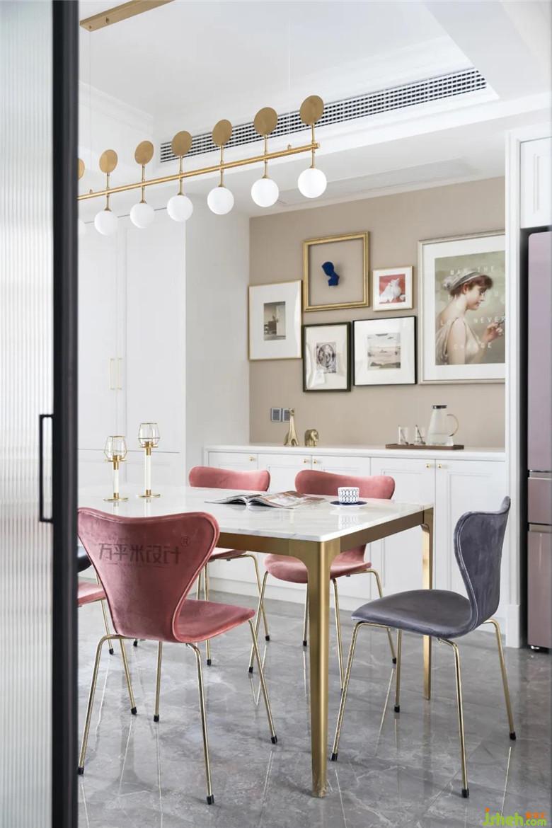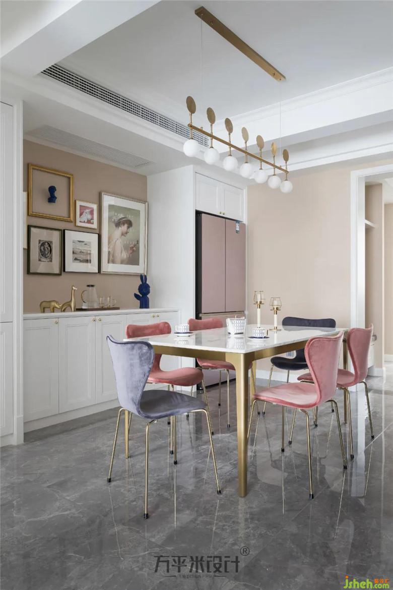 轻奢质感餐桌与吊灯两两呼应,佐搭细脚丝绒餐椅,创造轻盈视觉感,也让色彩鲜明的物件在空间中跃然跳动,彰显休闲浪漫的就餐氛围。