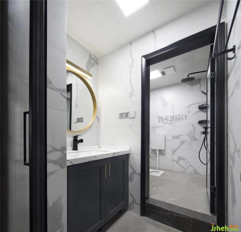 装修公司移动次卫与厨房之间的隔墙,破解原先格局带来的压迫感。因结构问题,需提升地坪才能建造蹲便区,以黑色门框为台阶,起到提醒的作用。