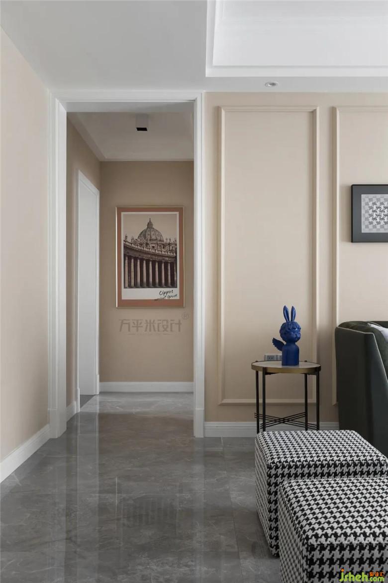 延续主色调至过道端景,与古城堡装饰画相映成趣,从公共领域到私密领域,具有一气呵成的连贯性。