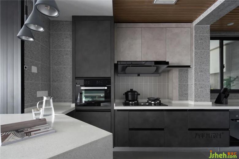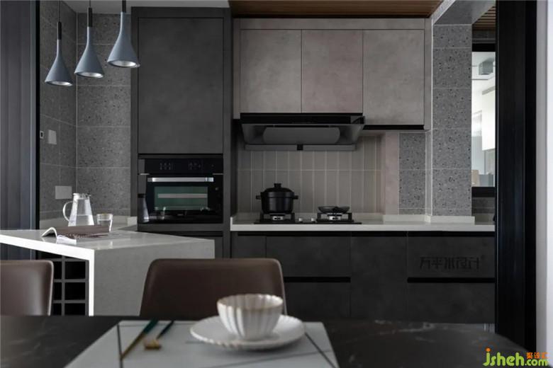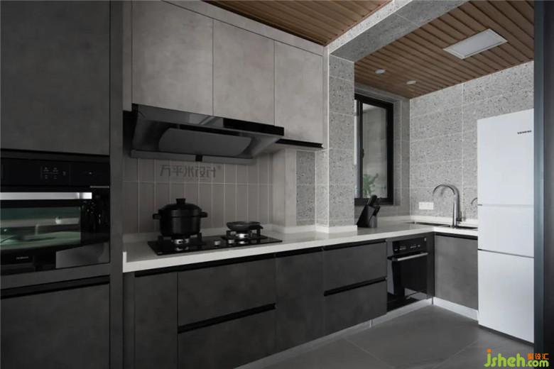 厨房装修公司调配不同质感的材质叠砌立体层次,既有延展过度,又有细节叠加。顶部的科技木吊顶比普通扣板整体性更好,在不同元素的碰撞中,创造内敛沉稳的个性张力。