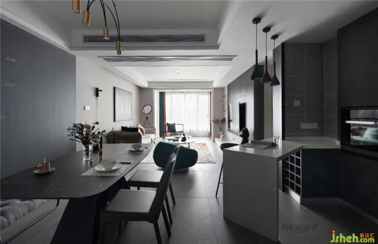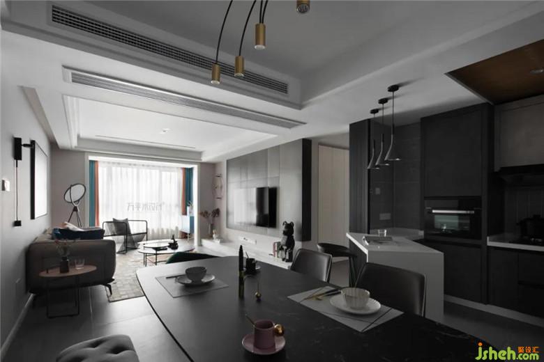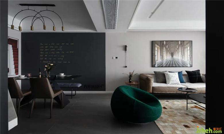 装修公司以明暗色块划分区域,形成鲜明的质感对比。选择中性色调的木地板,弱化其存在感,突出硬装与软装间的搭配。