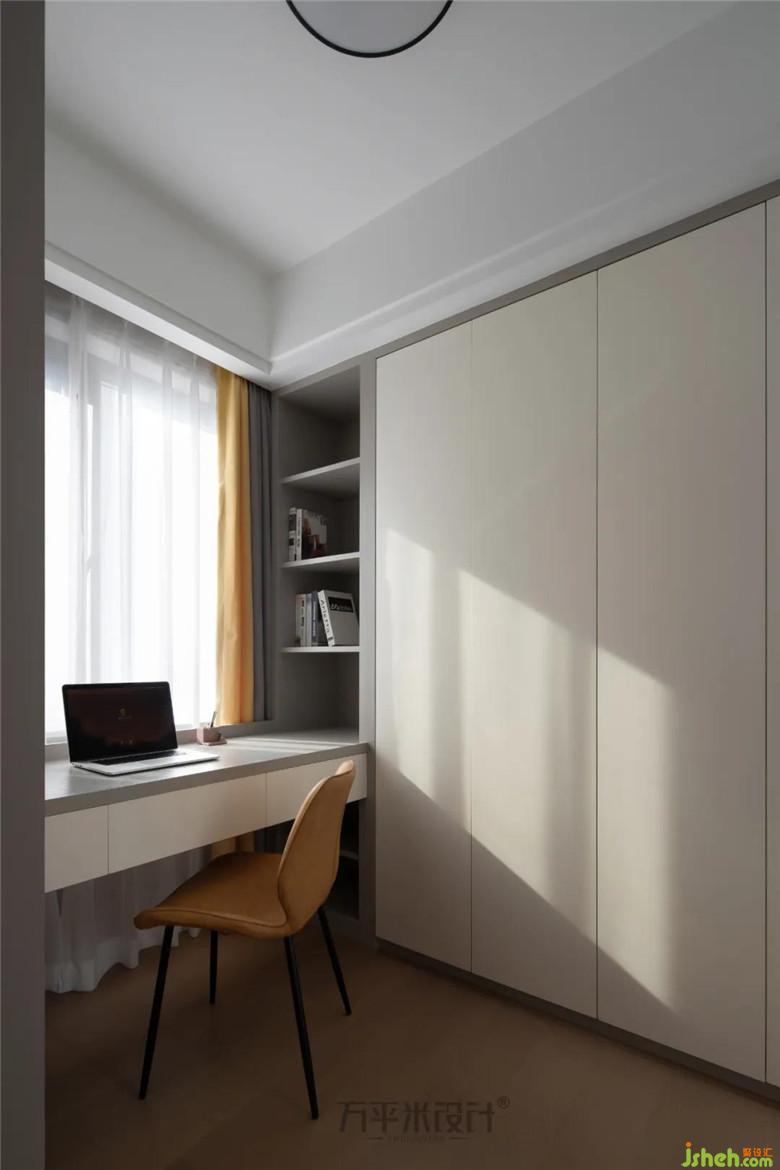 书房兼做衣帽间,反弹式柜门使整体立面简洁美观,通过材质与书桌延伸在一起,形成规整大方的视觉效果。