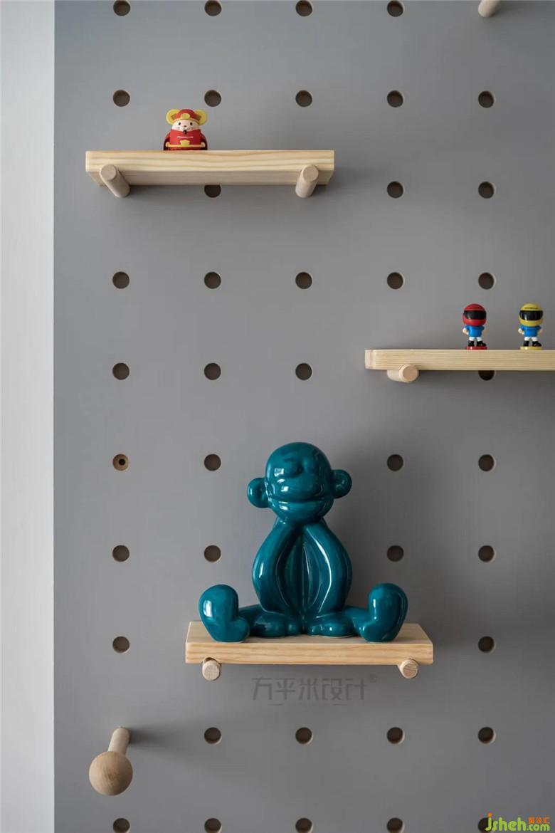 墙上的洞洞板,便于孩子挂上自己喜欢的玩具和小装饰等,增加空间的趣味性。