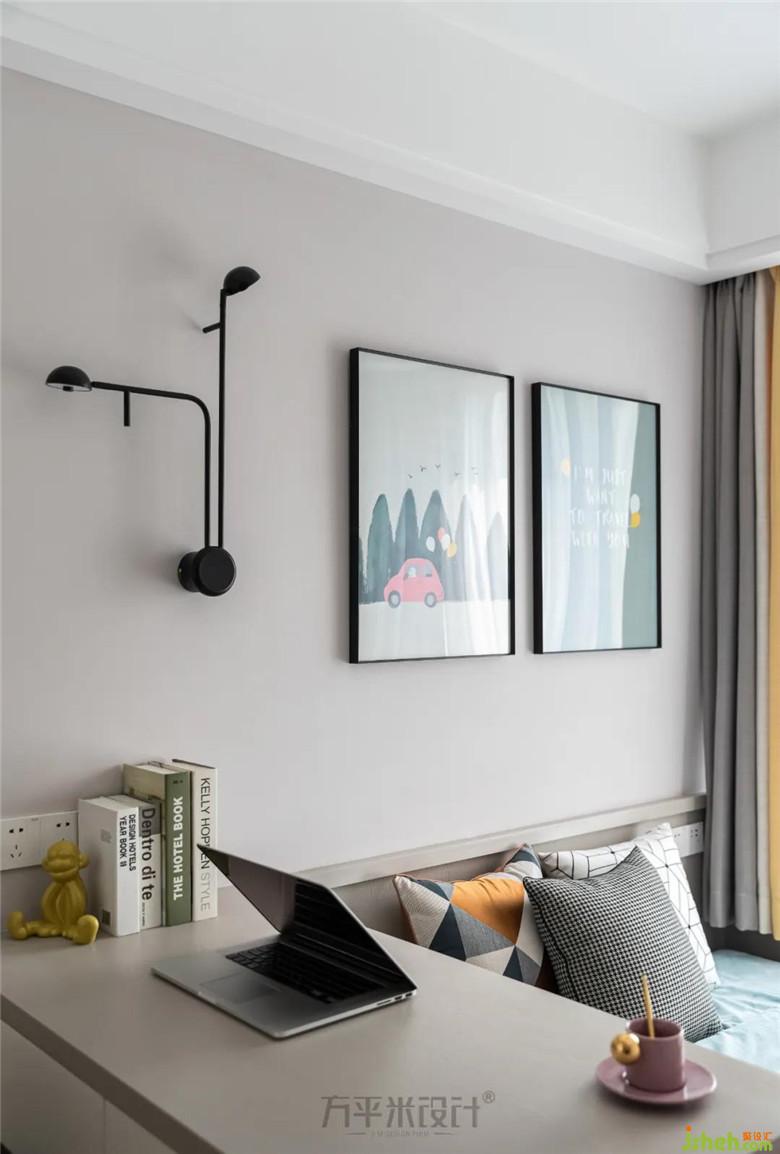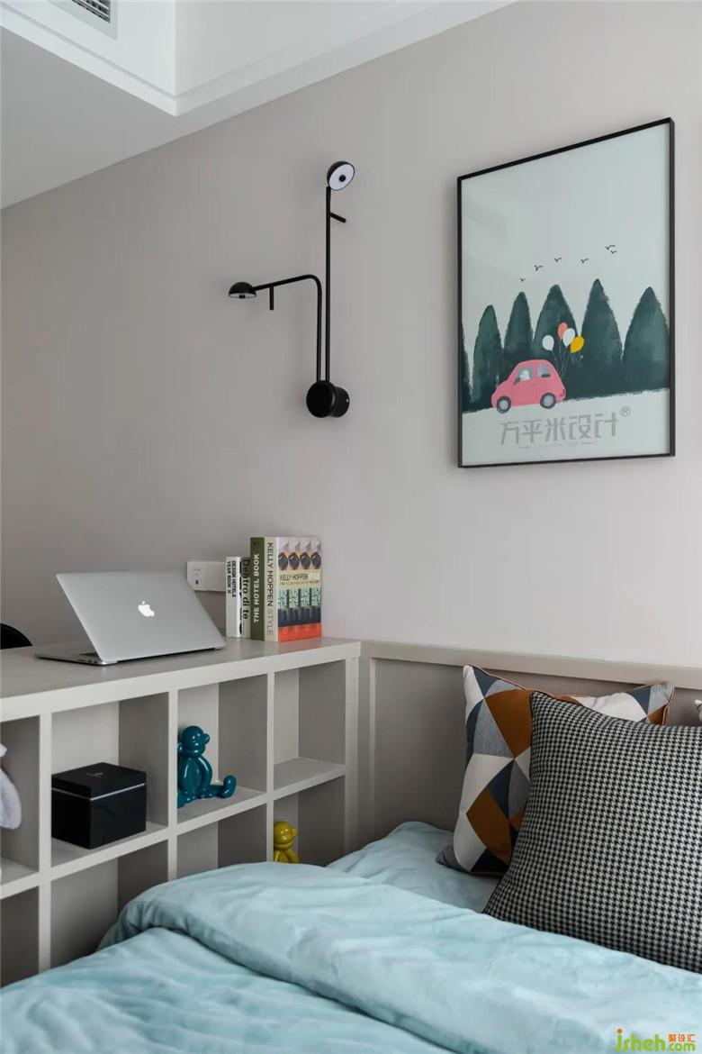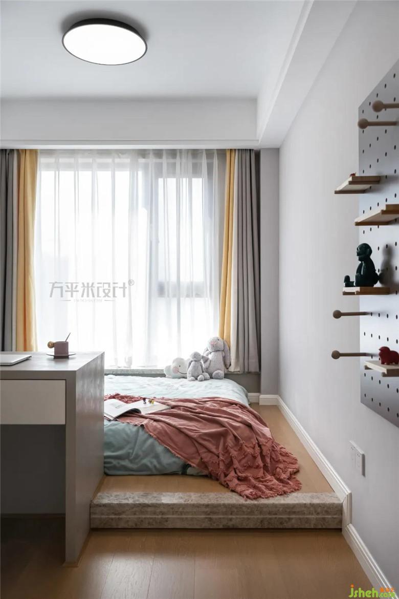 除了玩耍区外,学习区也必不可少,将书桌围合地台床设计,内侧有隔断可收纳物品,使有限的空间承载丰富的生活场景。