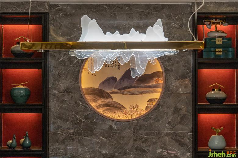 跳跃的红色结合异形的结构,形成了一个个动态的内饰,十分抢眼。简洁的射灯为红色墙面增添了几分灵动与跳跃,不但成为活跃空间气氛的亮点,而且避免了大面积铺陈所带来的压抑感,一定程度上实现了空间的视觉扩容。餐厅设计