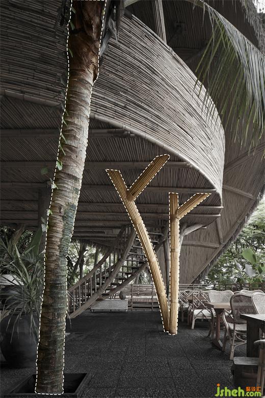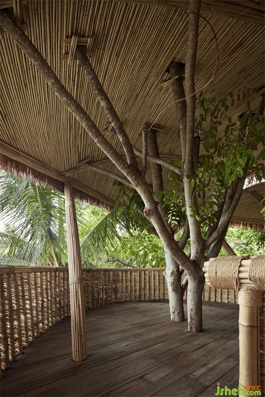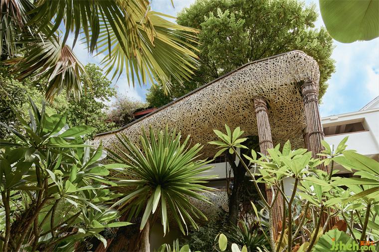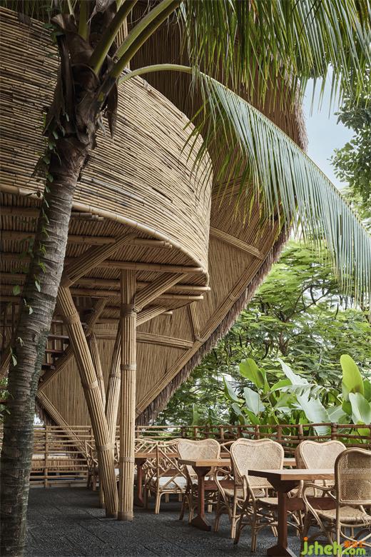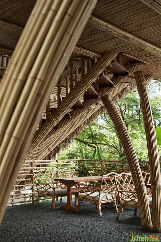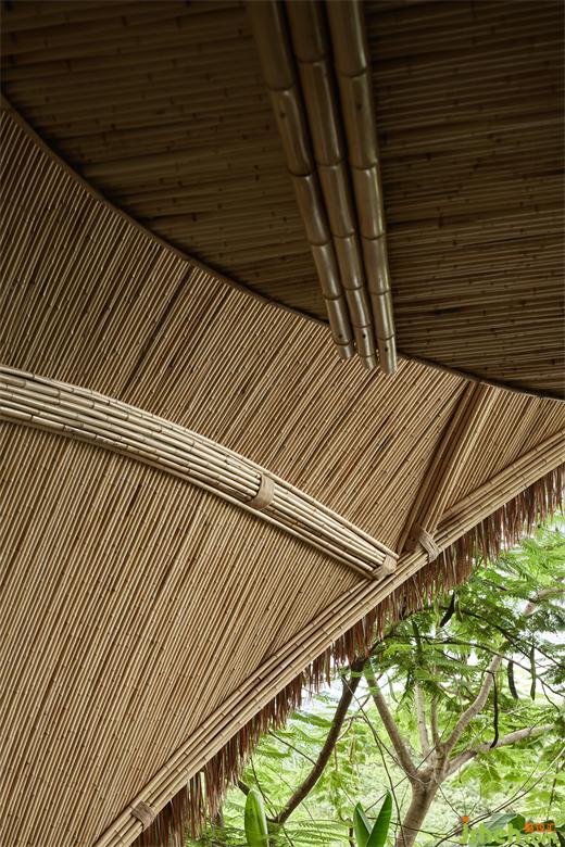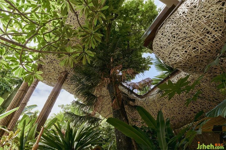 在楼梯外的延伸空间,我们选择采用版纳传统的竹编古法技艺,会所设计为这个空间创造了一种与自然深度连接的机会,仿佛将内外世界融为一体。这里不仅有独特的观景体验,还有自然的治愈力量。