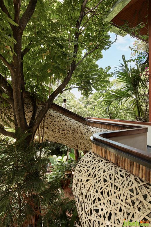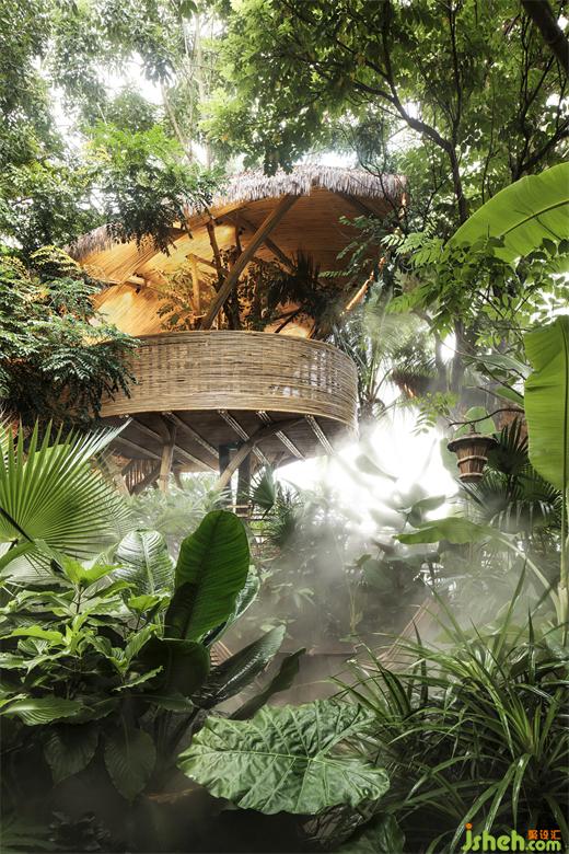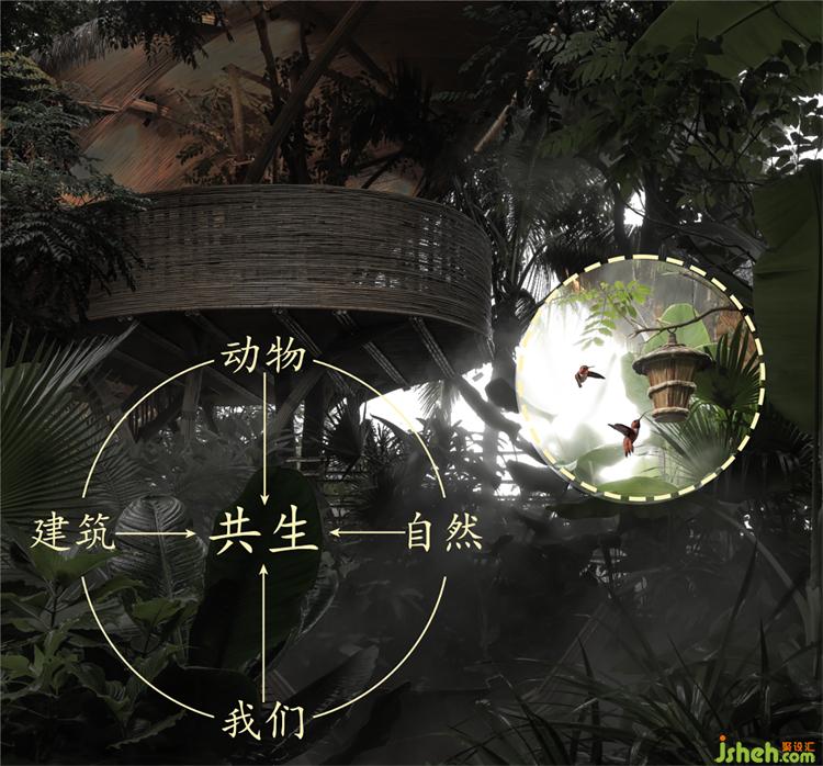 我们在为人类设计体验空间的同时,我们并没有去驱逐甚至破坏“原住民”的家,我们将小鸟的住所艺术化保留了下来,每一处设计细节,都尽可能尊重自然,融合自然,将建筑本身化作雨林的一部分。