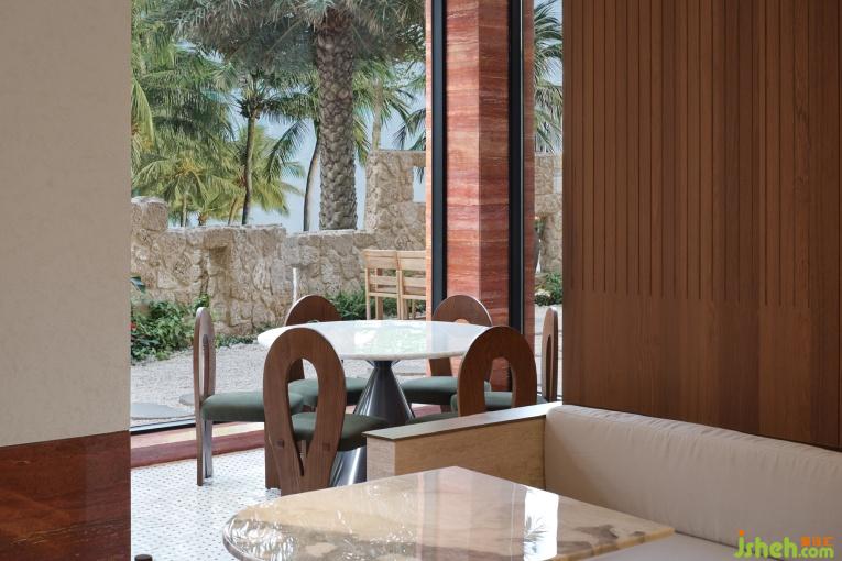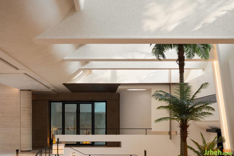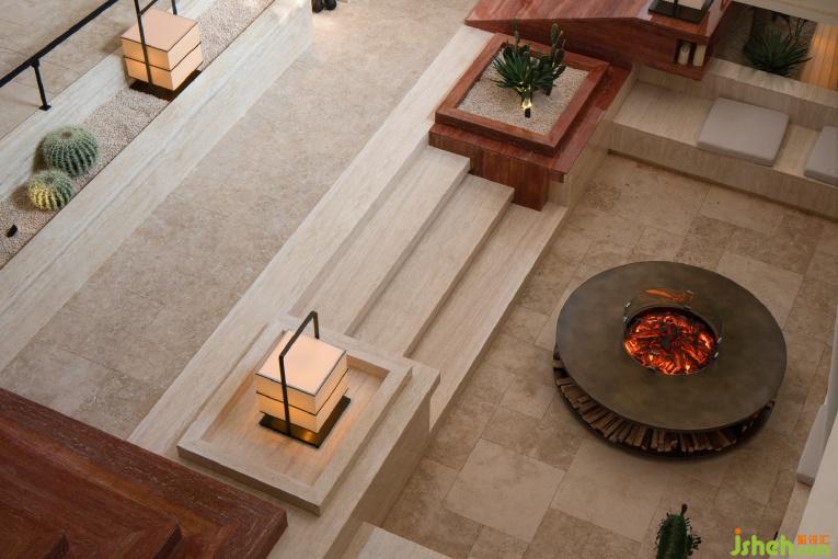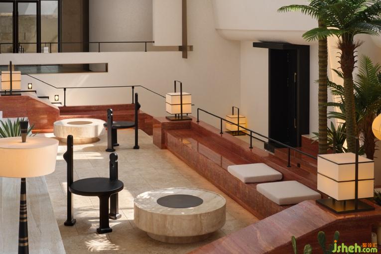 酒店设计在公区的核心空间,我们创造性地利用了天井与下沉空间,打造了一方“绿洲秘境”。自然光从顶部被巧妙地引入室内,光线与阴影为内向型的空间注入生动与灵性。