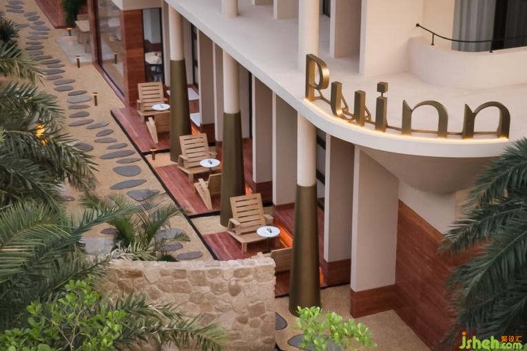 酒店设计花园中则选择了沙地与不规则形状的汀步作为点缀与过渡,以松散自由消弭了建筑外观本身因简约而带来的距离感。