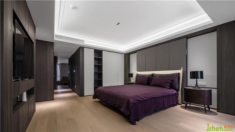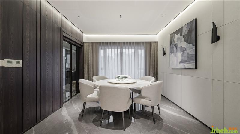 设计师在客餐厅两区一体开放式空间布局上,引入自然光影,并利用墙面深木色天然木皮材质块面分割,将餐桌与沙发区连接,形成一个通透、连续的空间体验效果,让功能与视觉都得到满足,轻盈而富有张力。家装设计