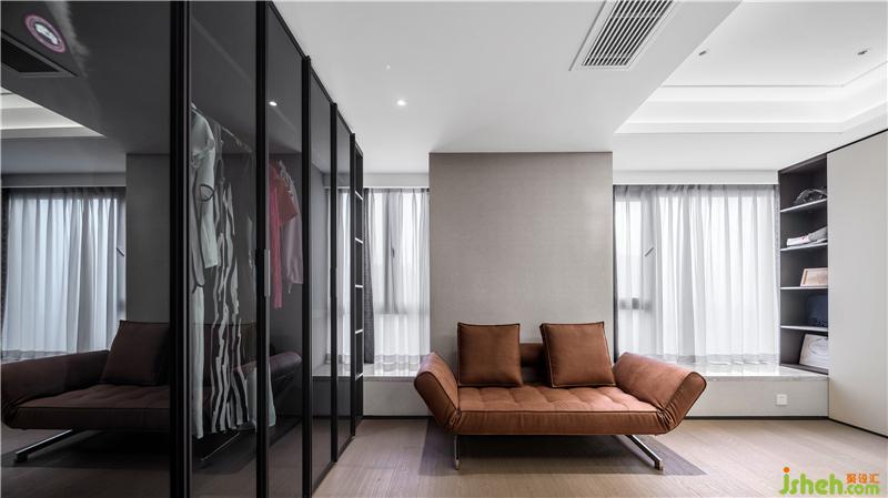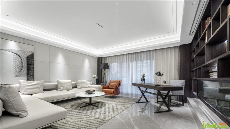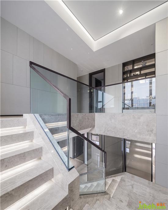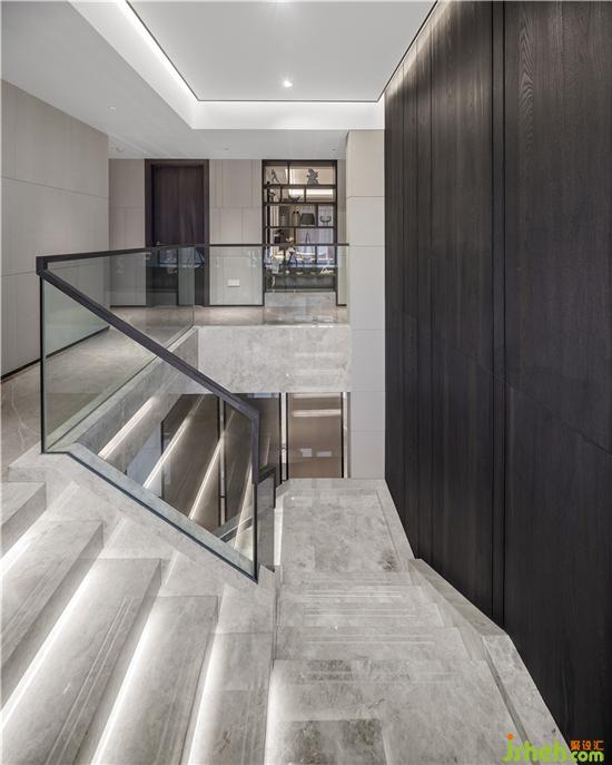 楼梯间,大面积扪布与温润的天然木皮材质及大理石地面相互碰撞,浑然天成,石材的交迭运用,深邃的沟缝,简易有力地勾勒出立面线条使得立面在细节处理上更显细腻。楼梯贯穿了一二层的空间关系,让室内呈现出不凡的精神气质。