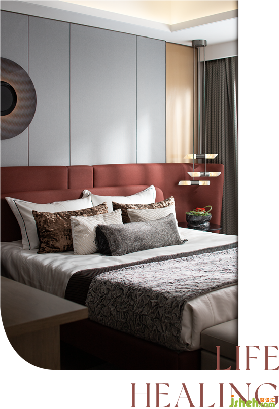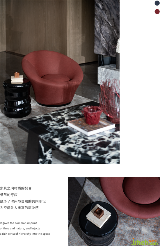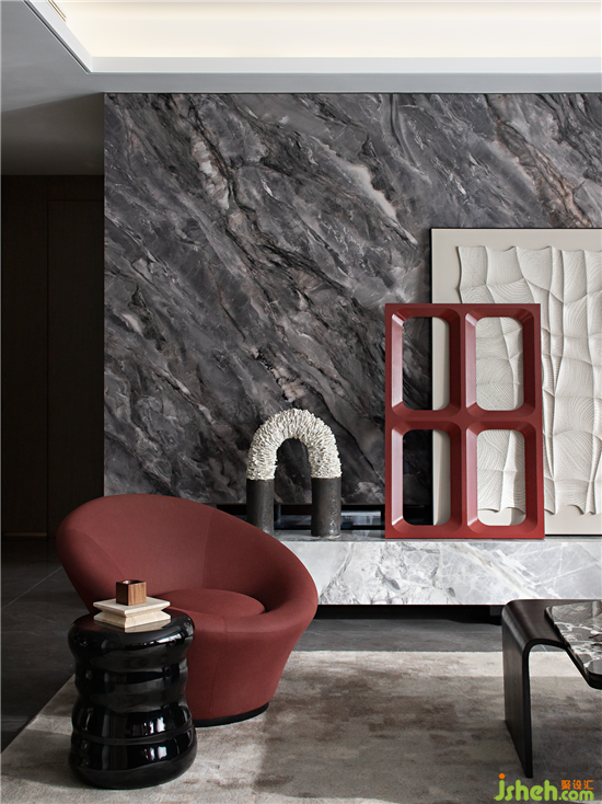 石材木饰的自然肌理,抽象的手工地毯,自由无序的艺术摆件,围合出优雅专注的情感交流空间。