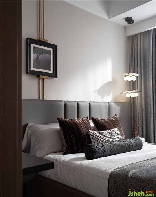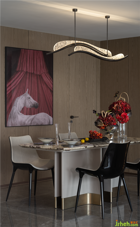 精炼的动线延伸了餐厅的阔绰尺度,墙壁上大幅骏马装饰画,几何形状的吊灯穿插错落,成都样板房设计增添了空间的灵动与平衡,为空间带来丰富的视觉观感。