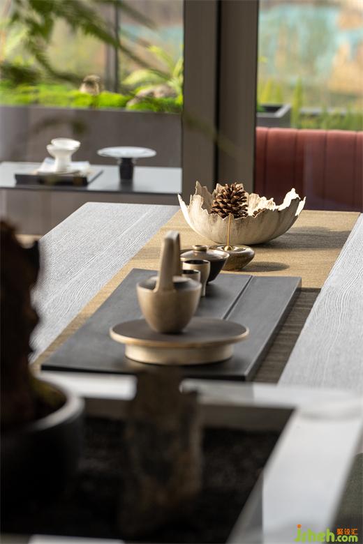 朴拙的茶台与精致的茶具形成对比,清雅气息在空间中盎然生长,抒写旷远灵动的诗意。