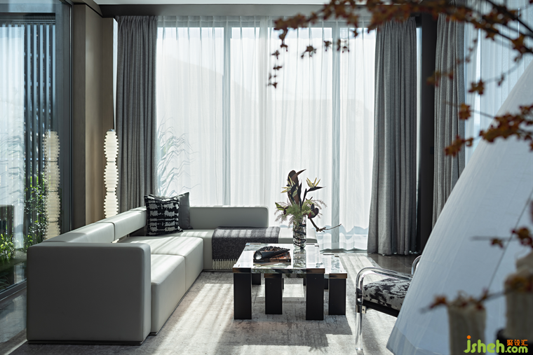 样板间设计糅合山居生活与当代设计风格,以静谧优雅的风格诠释国际现代奢华的诗性与意韵,构