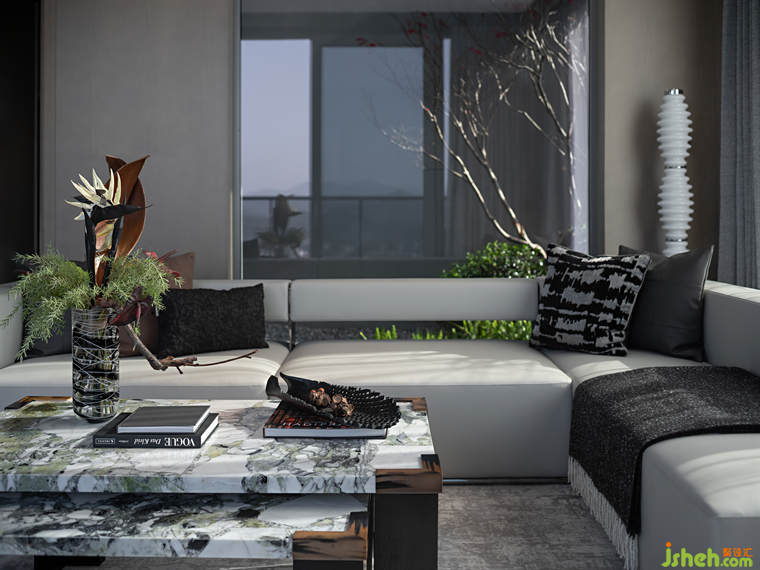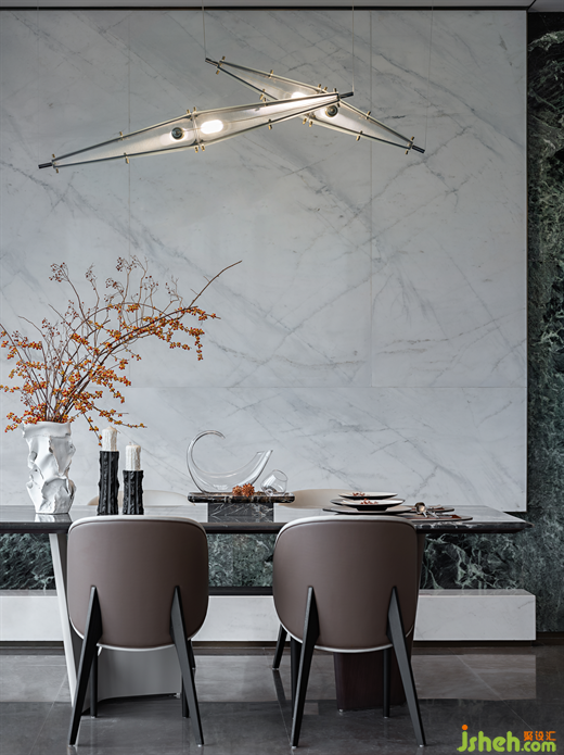 空间以简洁的线条勾勒,皮艺沙发的优雅、天然石材的随性、花艺装置的灵动,随着光影的