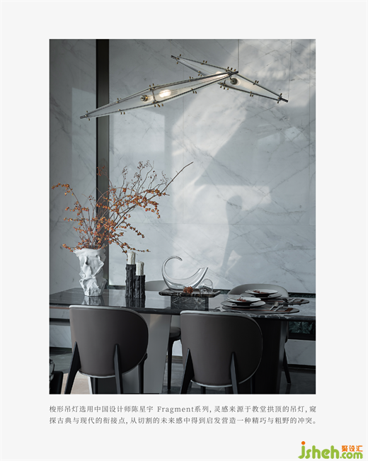 大尺度的天然石材氛围铺陈了空间的纹理,通透而舒展;梭形吊灯相互交融的玻璃与光线,