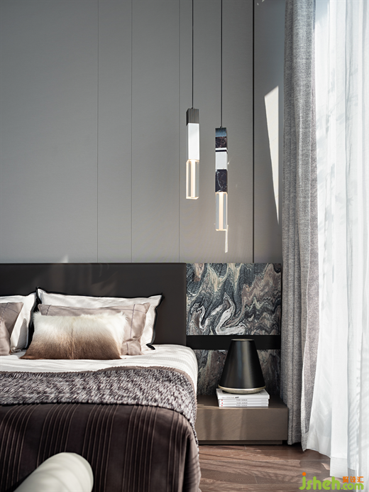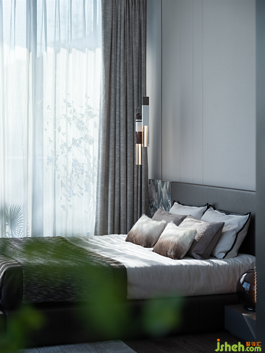 帘影斑驳,摇曳生辉,没有过多的色彩渲染,营造一种更为宁静的柔和氛围。床背的自然肌理与床品、艺术吊灯相呼应,平衡主卧空间的同时,于细节处增加主卧空间的质感。