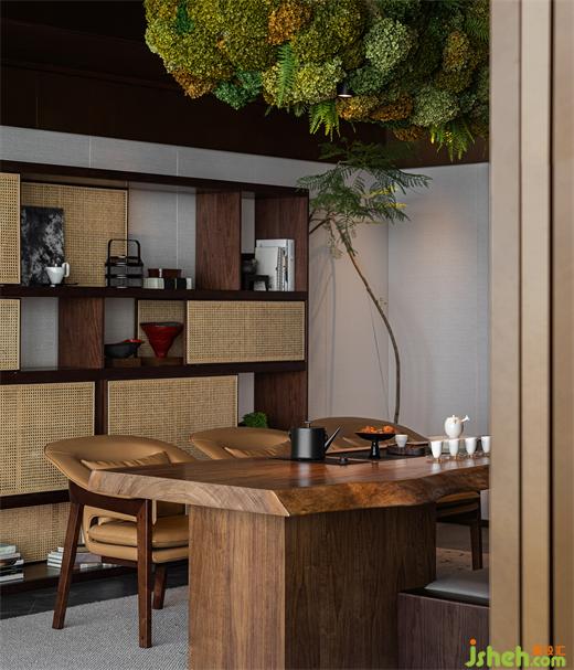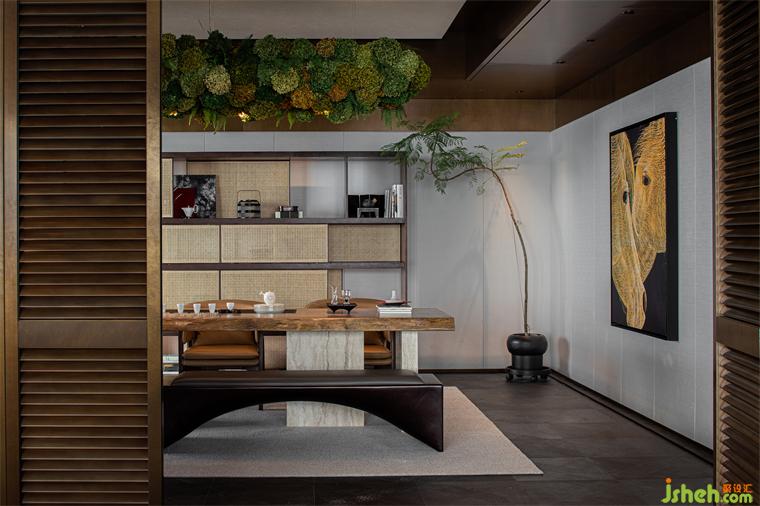 自然气息的藤编元素与温润原木、悬挂花艺装置驻留了一片生机盎然,会所设计在原始的有机形态中迸发出质朴纯粹的美感。