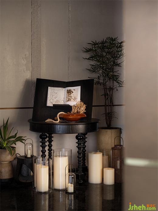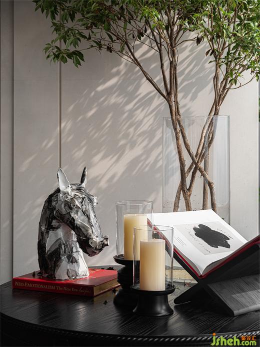 墨马雕塑与花艺在端景台上演着自然与艺术的共融,玻璃烛台则令场域实现意境的升华。