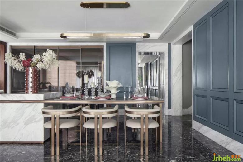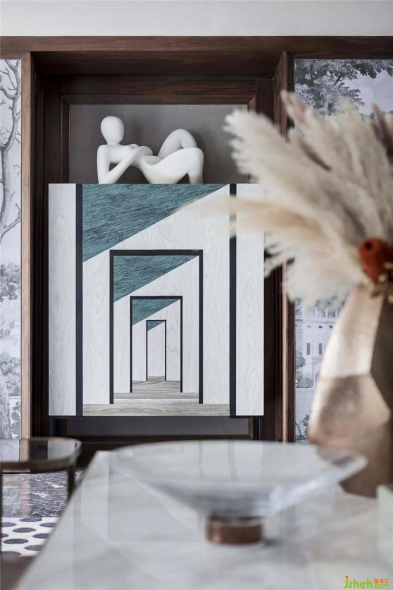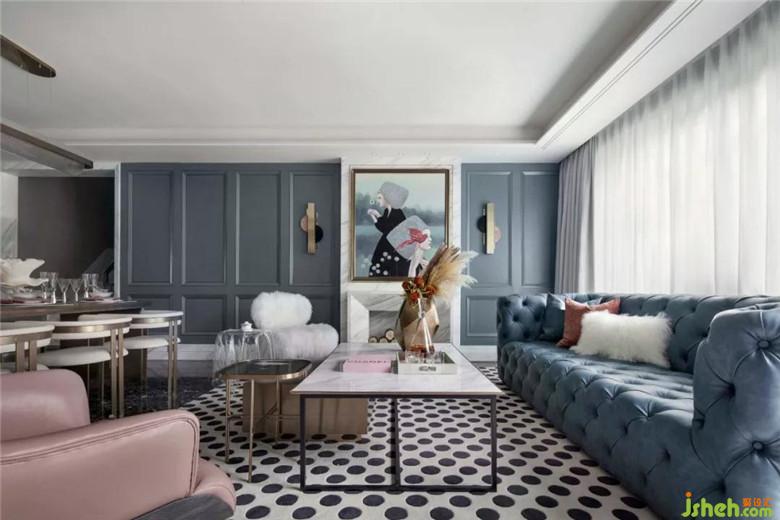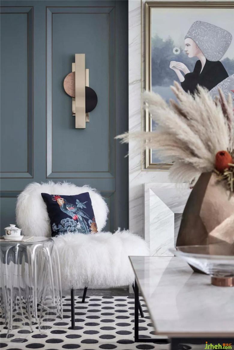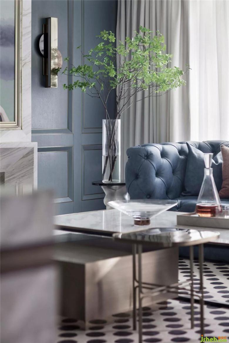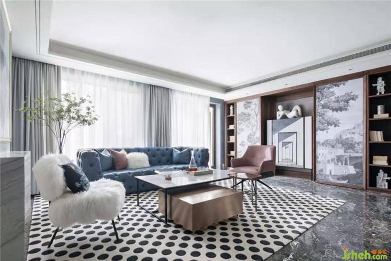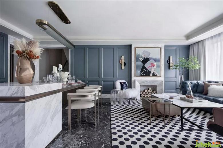一层客厅色深蓝基调下的冷静搭配橙色单品,突出点亮空间,又汲取中世界文艺复兴的一些艺术灵感引入空间,素色软饰增强了空间呼吸性,复古格调让空间更有艺术气息。现代感家具被赋予更多质感,与精致饰品化身为新艺术潮流。经典图案的黑白元素,点燃了空间氛围。