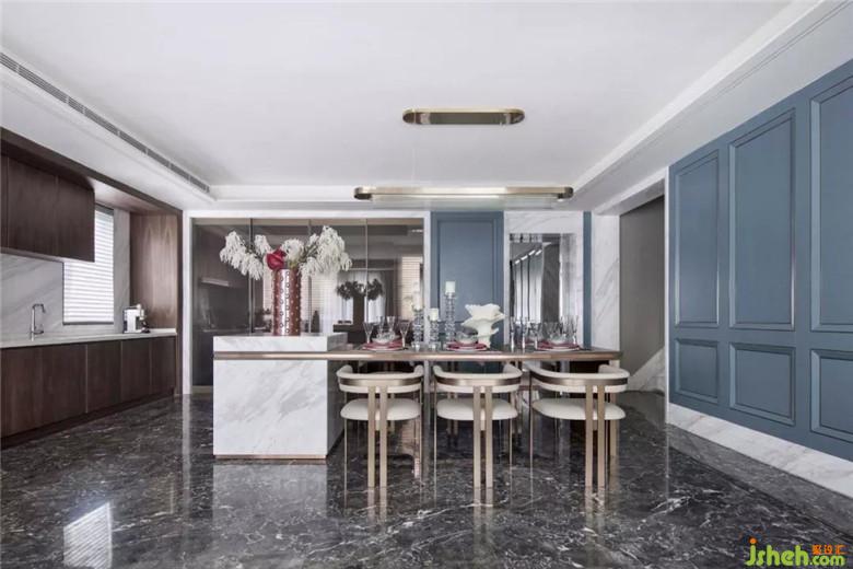 餐厅餐桌大理石台面与金属脚搭配冷静又沉稳,金属配色的质感,现代感十足,不经意的细节中舒缓着法式优雅。白色的瓷器摆件姿态万千,犹如婀娜多姿的舞者,也如同舞者飘逸的裙摆,又如同盛开的花朵,无不呼吸着法式优雅,不局限与风格就是独有的风格。