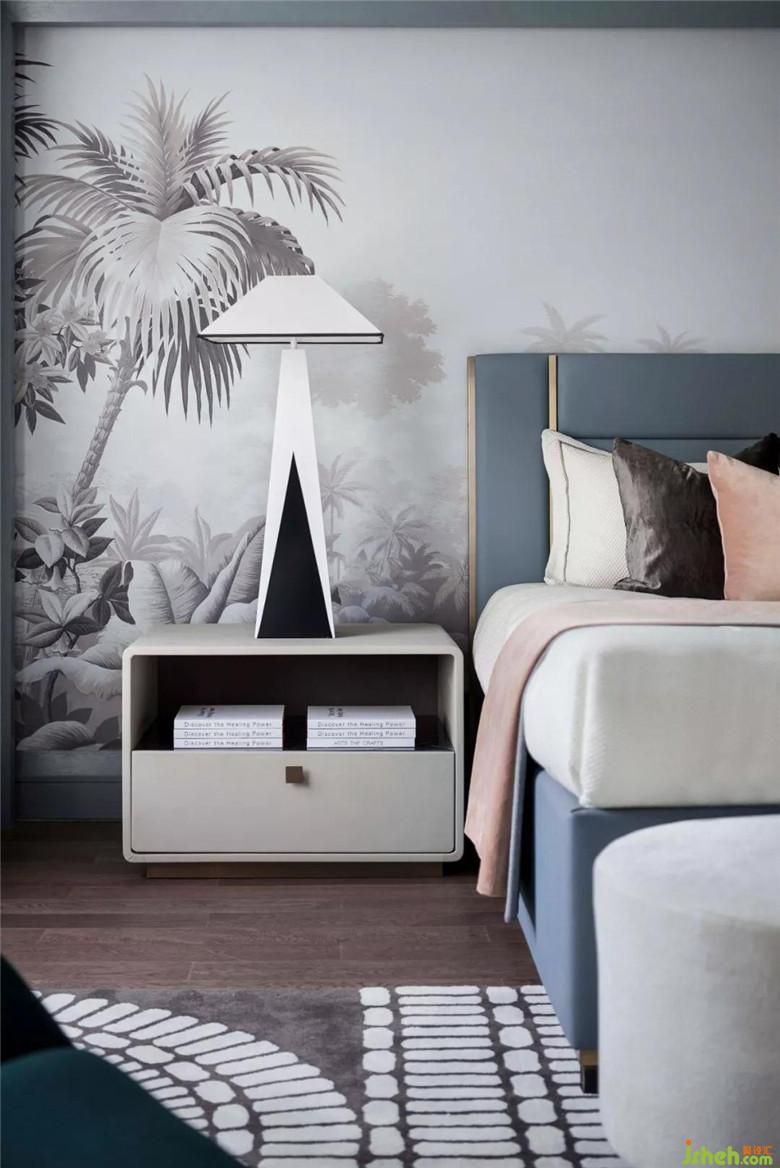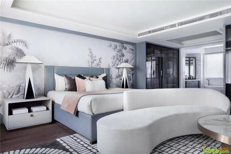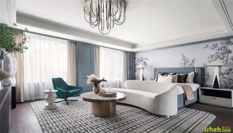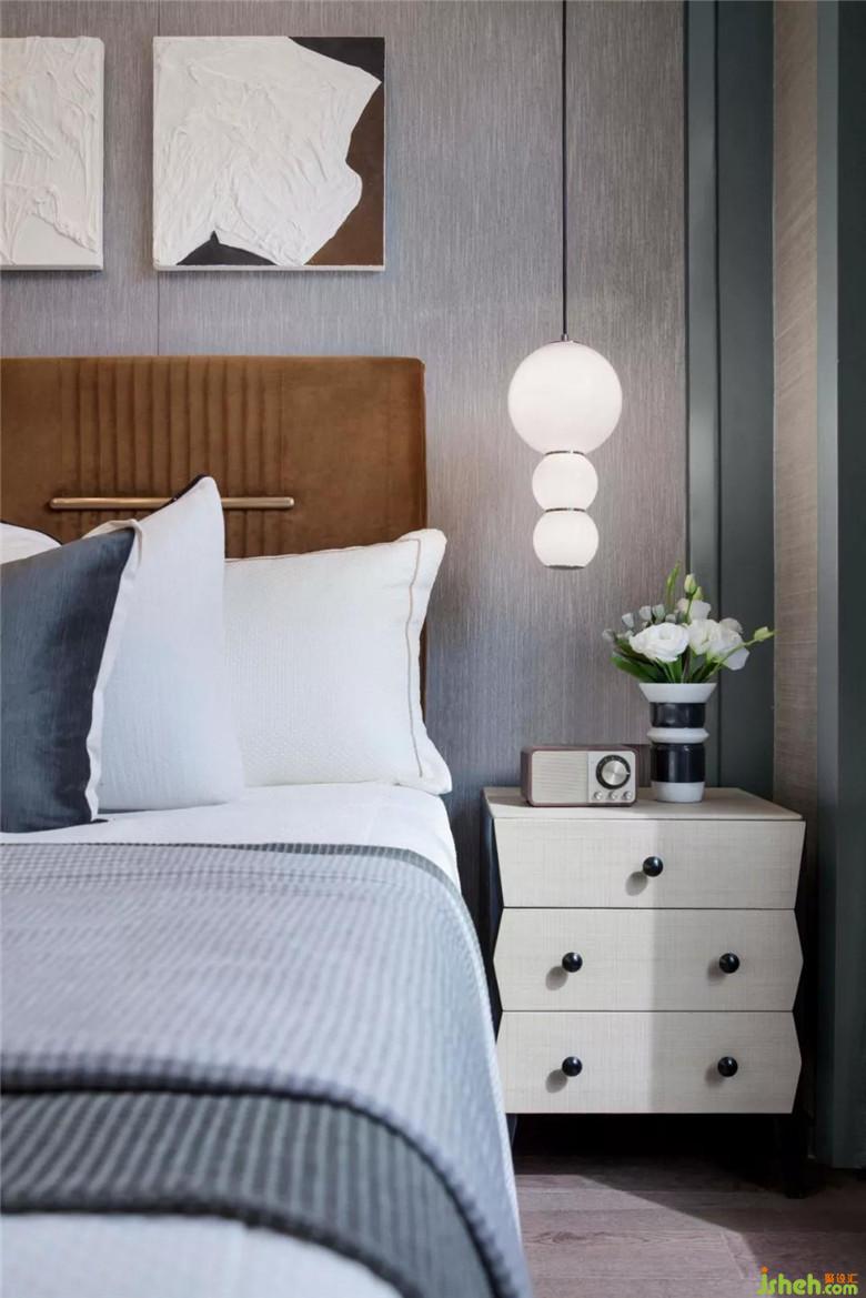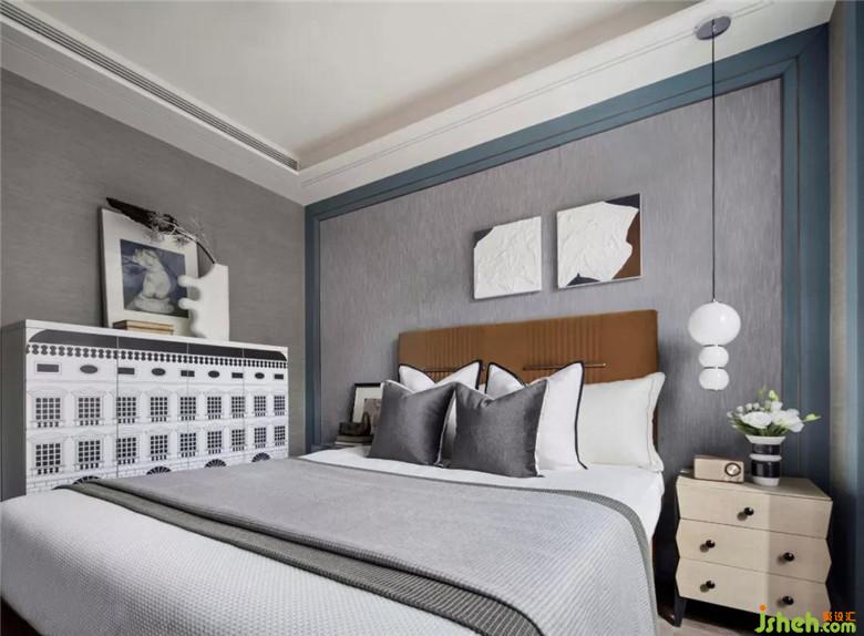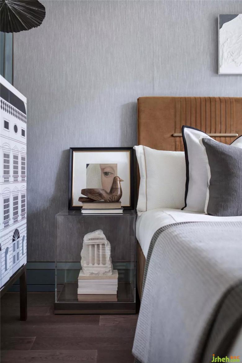 长辈房空间色调更加稳重,选用大量的灰色调,营造空间安静的氛围。在宁静平和的睡眠氛围中,柔软的织品更添舒适感。金属质感的鸟与空间主题辉映,几何灯具打破了深色软式的沉闷,令空间更为平衡。