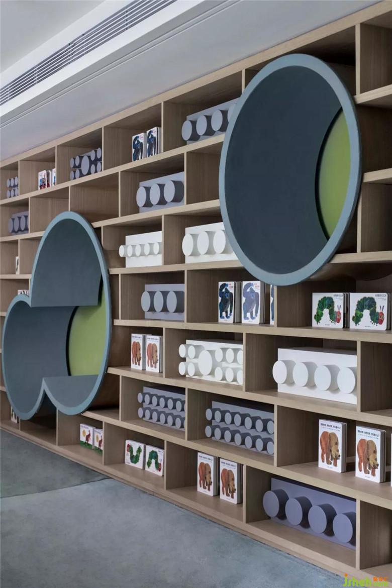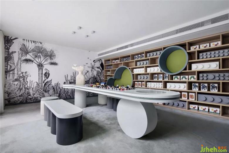 白色为主的个性不规则桌子,一处以圆形支撑的设计灵动了空间,木色橱柜摆满了益智玩具与丛林书籍,从儿时熏陶人类与自然的知识世界。