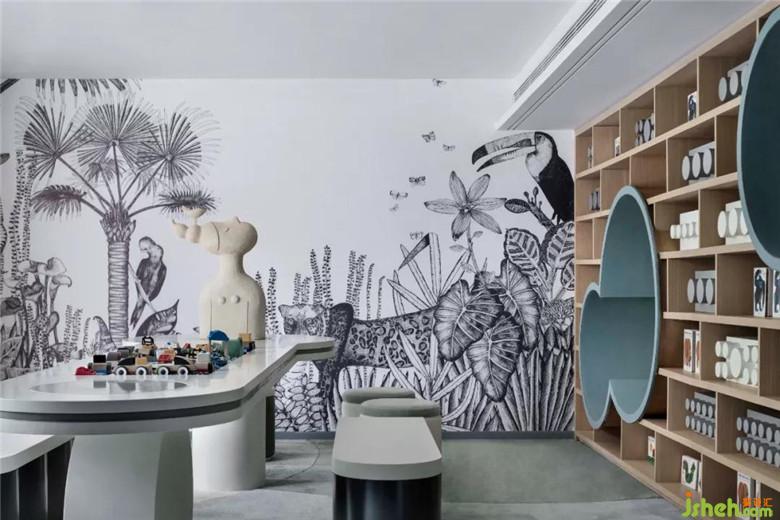 经过艺术感的过道,是充满童真童趣的益智儿童空间,这里仿若丛林的壁画,颜色予以视觉无限延伸感。