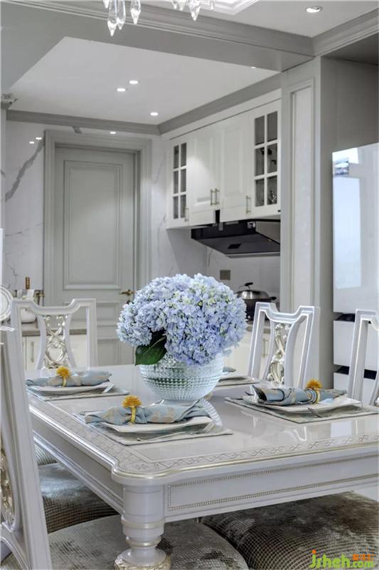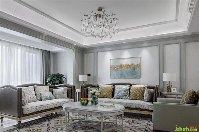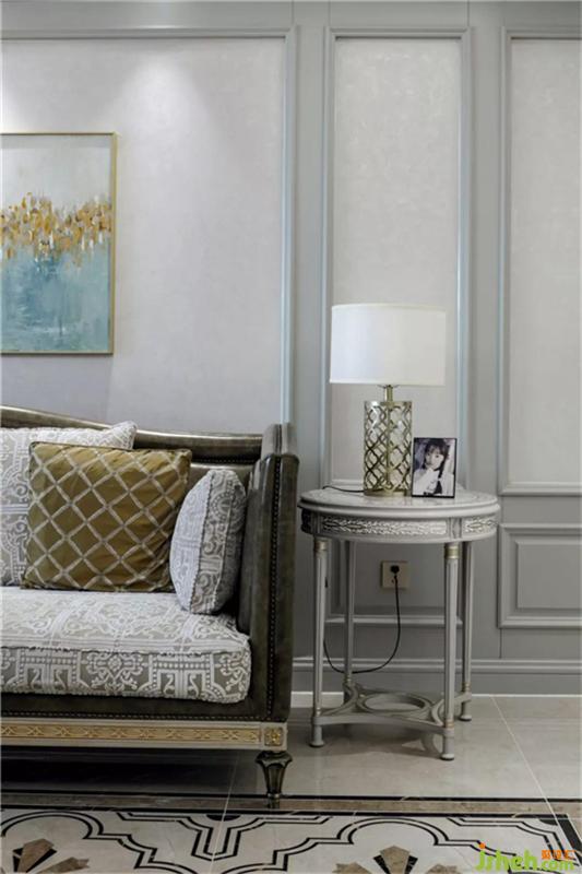 客厅整体色调顺应了主色系—淡绿色,整个空间柔美而又优雅,因为公寓楼的层高的局限,我们在天花是设计上采用的穹顶的设计,拉高了整体视觉,生活既来自于炊烟袅袅,而设计又赋予了生活更多的诗情画意。在这个空间里,每一个角落都是一帧美景。沙发布艺,罗马格纹地毯的柔性软化了空间直角的硬朗,墙上的壁画,窗边的绿植,为空间注入了生命的活力,又不失质感。