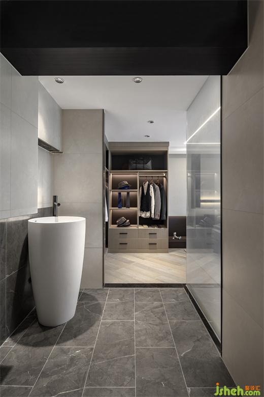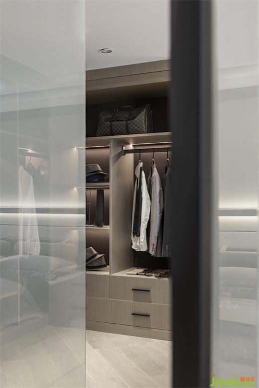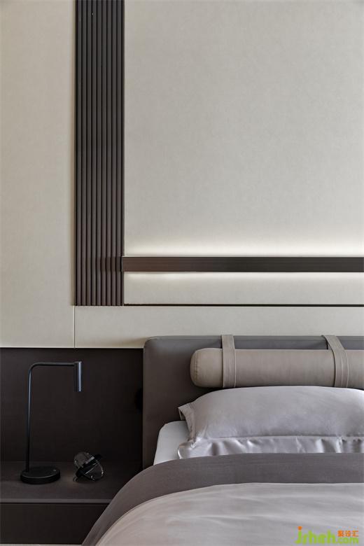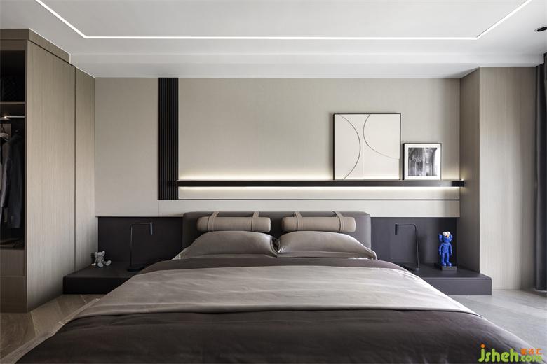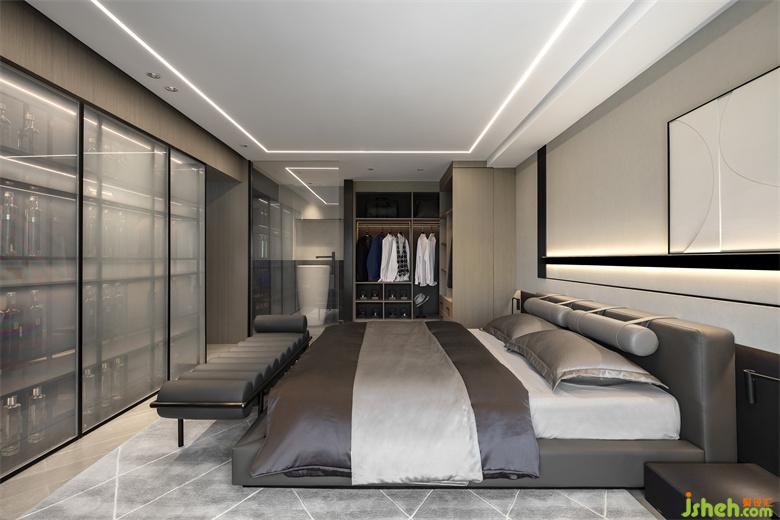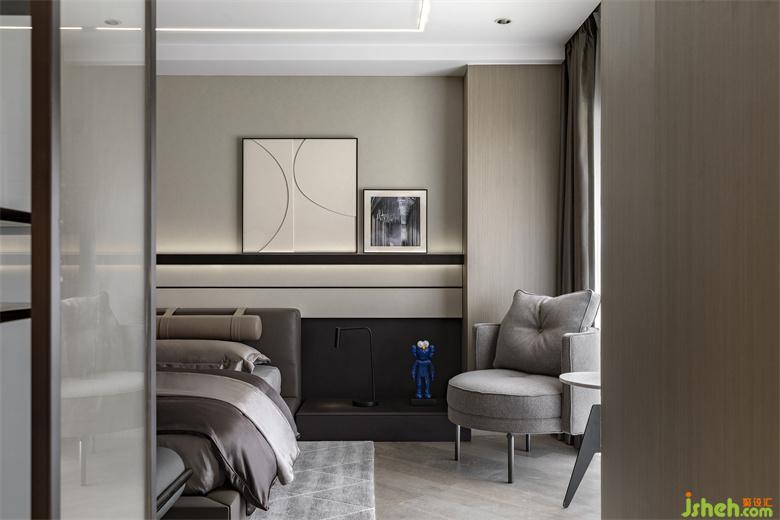 样板房设计卧室设计动静结合,对整个二层空间进行合理的划分,减少生活中流动线路的纷扰。空间内线与块的结合沟勒出时尚的魅力,无主灯使得空间设计简约整洁,而射灯的灯光又满足各功能区域的光源需求,使得空间纯净舒适,有序归整。软装表达上将灰色发挥到极致,糅合比例到最佳,点缀蓝色KAWS,营造简约奢华的风格,同时空间线条的深浅叠加,使空间深邃富有质感。使得空间深邃且富有质感。