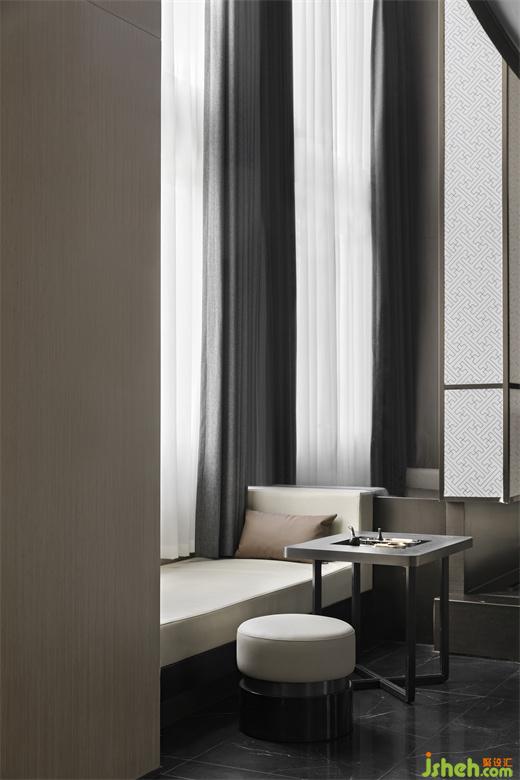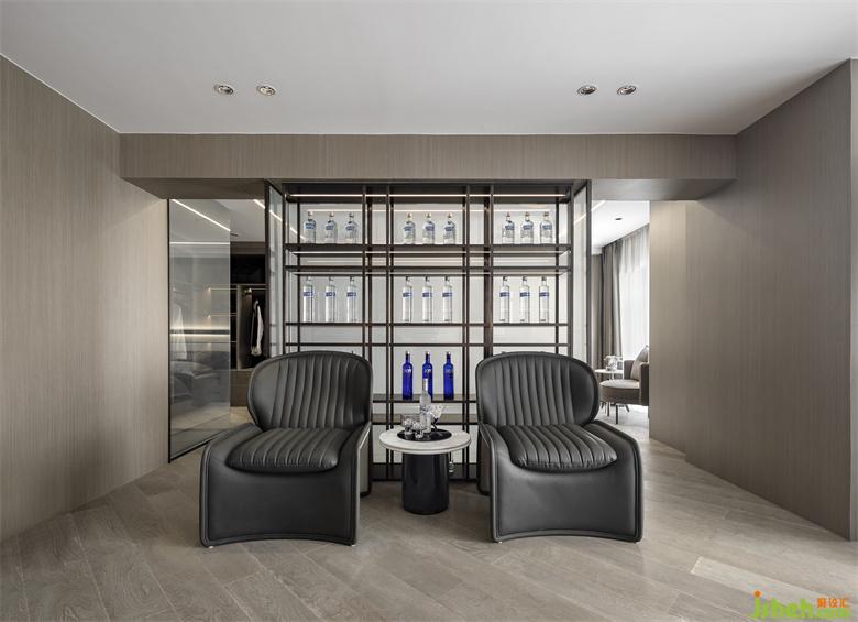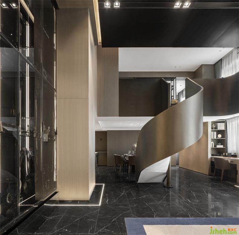 卡座旁设置棋牌区和卡座区,与洽谈区交互共融。多功能区临窗而设,可供把玩腕表,指针划过空间,瞄准蒸蒸日上的方向。旋转楼梯对客餐厅区域自然划分,餐厅区域空间典雅整洁,黑色大理石地砖与木色软装墙壁、暖咖色的餐桌椅简而不华,不适优雅。黑色不锈钢和烛台,在灯光衬托下,质感晶莹,立现生活质量感。曲型旋转楼梯蜿蜒而上,呈现大气沉稳姿态。储酒间私密而又独立,杯盏摇曳间,放松工作与生活的的紧凑感,达到舒适惬意的优雅从容。