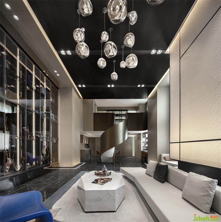 样板房设计空间大胆采用黑色不锈钢装饰,中性色木饰面,布局简约大气,内容精炼有趣。在软装上,用“精致”二字作为关键词,方便大家更好地理解我们的主题思路。艺术装置吊灯从上空悬垂而下,一束光将访者邀入至臻的纯净中,璀璨光感增加空间灵动的质感和流畅的现代感。充满尊贵气息的棕色面料,是自带高级感的;空间白色理石茶几的光泽感,活力蓝色调呈现的活泼轻快之感,为空间注入时尚而别致的氛围;黑橡木色平衡了视觉空间的色彩搭配,给人以冷峻、酷炫之感。