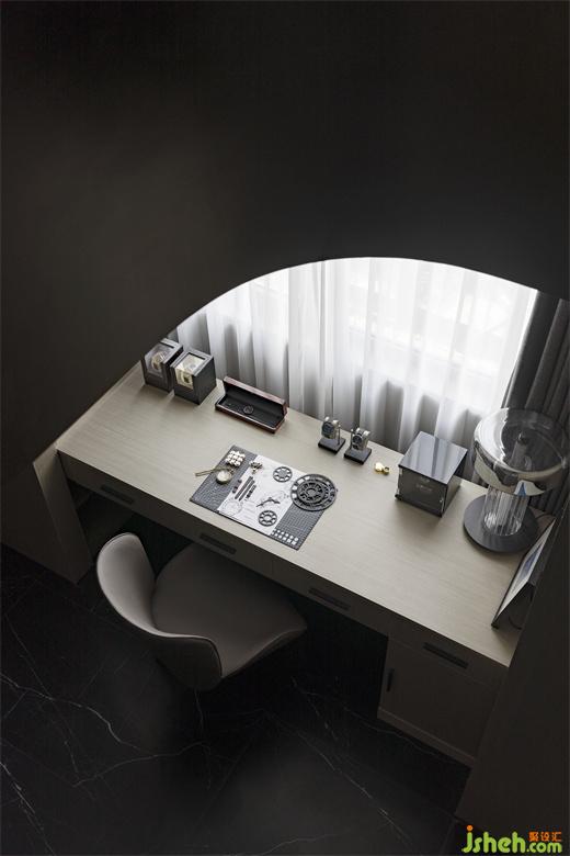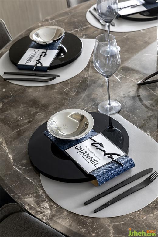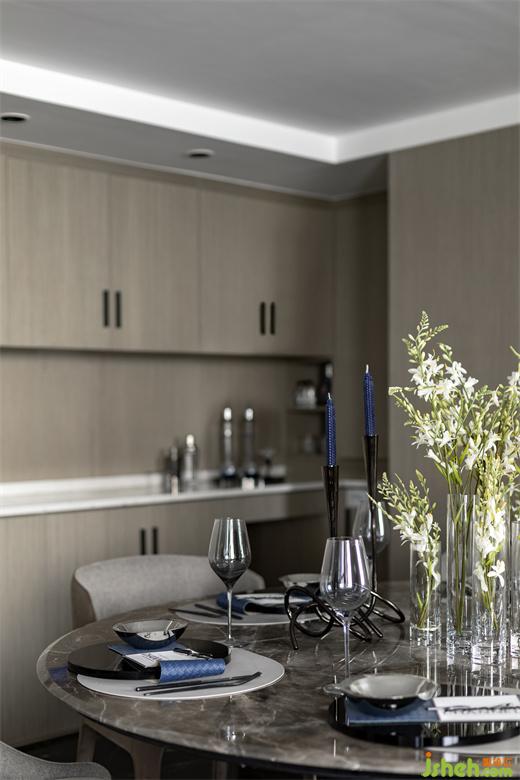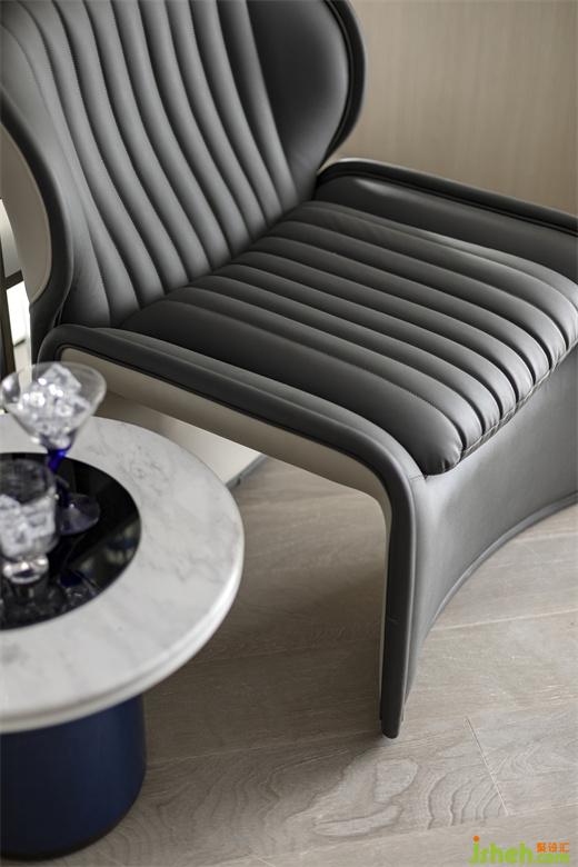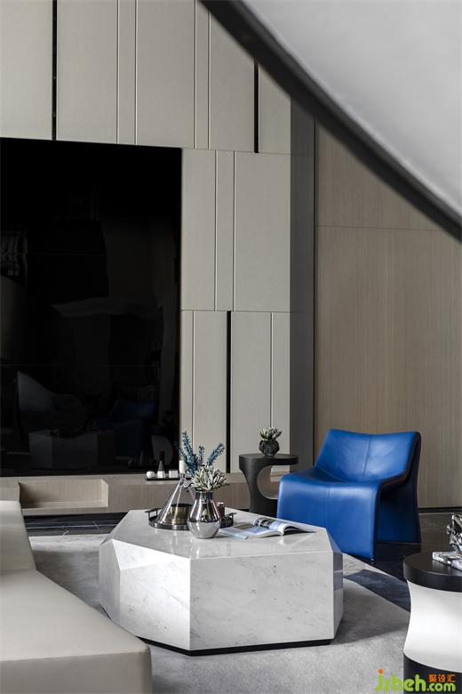 样板房设计师利用社交群体记忆与空间的关联转化,建立起新的空间体验感,大胆利用黑色突出空间的严肃感,浅咖色系调整空间温度感,用宝蓝色增添空间活跃性,使人们对熟知的实物产生新的兴奋感和舒适感,连接生活与艺术,商务与圈层,打造属于精英圈层的精神场域。